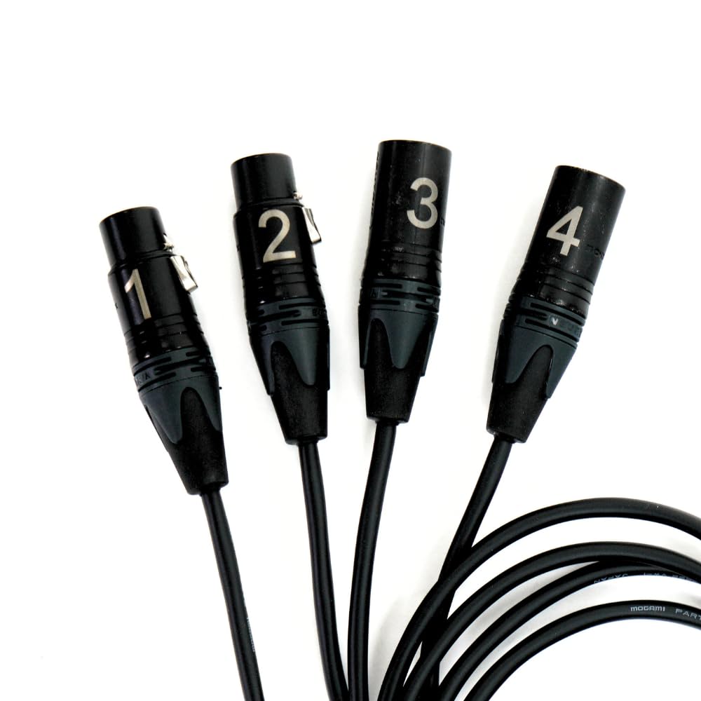 2. 4 CANALES XLR – Cuatro cables de grado Mogami AES3 de 24, disponibles en configuraciones de 2 macho/2 hembra o 2 hembra/2 macho, y un conector Neutrik etherCON RJ45. Compatible con señales analógicas, DMX, AES3, intercomunicación y alimentación fantasma de 48 voltios. Cuando se utiliza alimentación fantasma, se requiere cable apantallado.