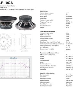 El woofer Sound Town STLF-10GA es un woofer de 10″ universal de repuesto para bafles PA/DJ y gabinetes de bajo; es compatible con los bafles PA de Sound Town y bafles de otras marcas que necesiten un driver de baja frecuencia de 10″. El woofer tiene una impedancia de 8 ohmios y un rango de frecuencia de 65 Hz – 5 kHz. Está construido en un chasis de aluminio fundido y tiene un cono de papel con borde de tela. Con una capacidad de potencia de 250W RMS, 500W de potencia pico, el STLF-10GA ofrece bajos potentes y profundos y es un gran woofer de repuesto para tus bafles de 10 pulgadas PA o gabinetes de bajo.