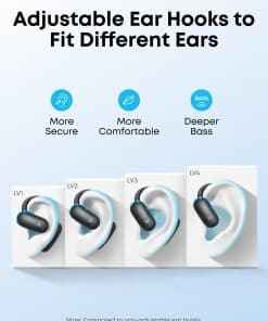 2. Un ajuste perfecto para cada oreja: Los innovadores ganchos para la oreja ajustables de 4 niveles de soundcore aseguran un ajuste cómodo adaptado a más del 99% de las formas y tamaños de la oreja.
