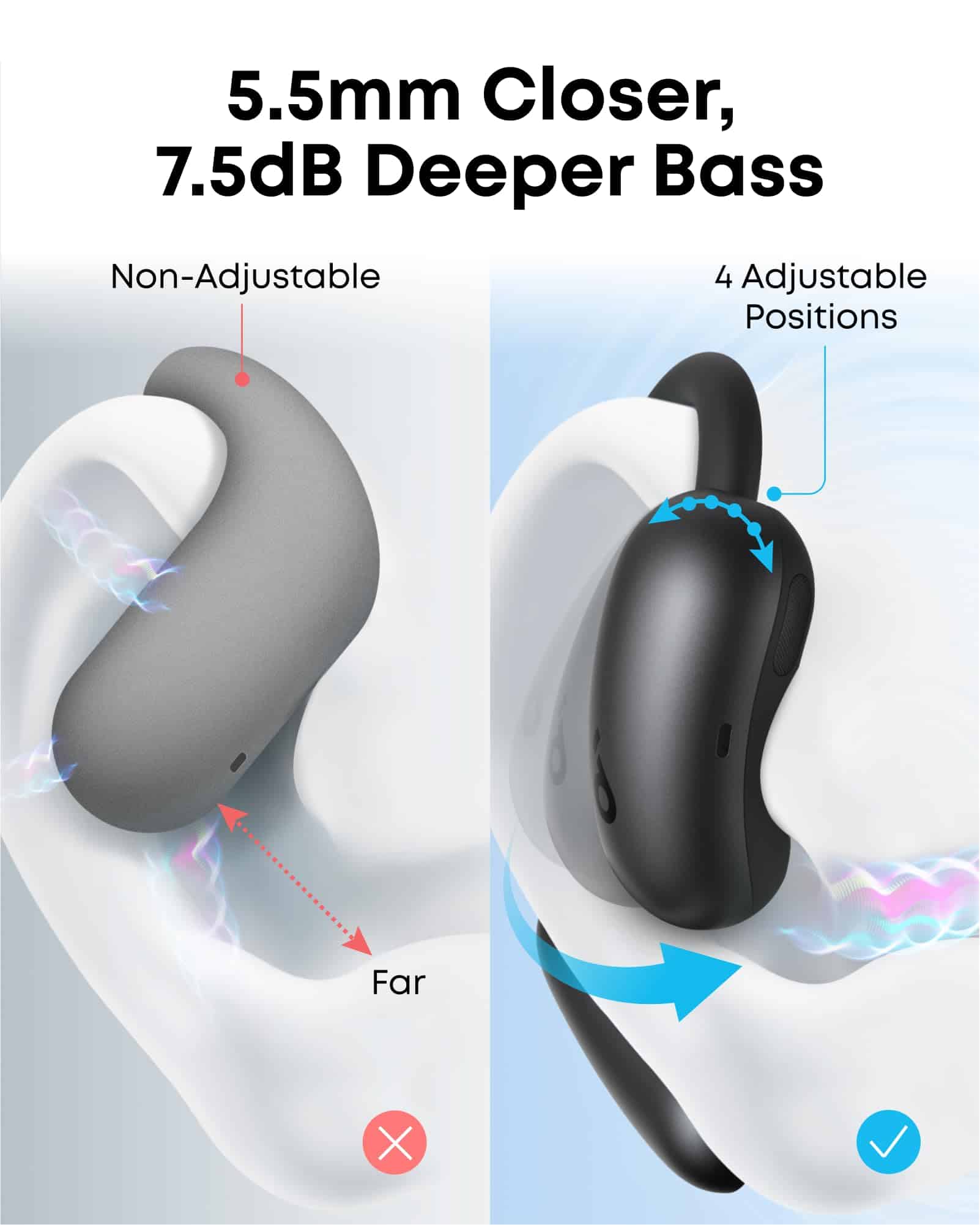 3. Cerca del canal auditivo para 2 veces más graves: Los ganchos para la oreja ajustables acercan el sonido, duplicando la salida de graves de los auriculares no ajustables. Un impulso máximo de 7,5 dB ofrece ritmos más ricos y poderosos. Nota: Datos del laboratorio soundcore.