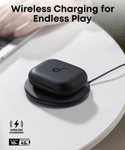 6. Recarga inalámbrica, larga duración de la batería: Coloca la caja en un cargador inalámbrico para una recarga sin enredos. Obtén hasta 10 horas de música con una sola carga, ampliable a 42 horas con la caja.