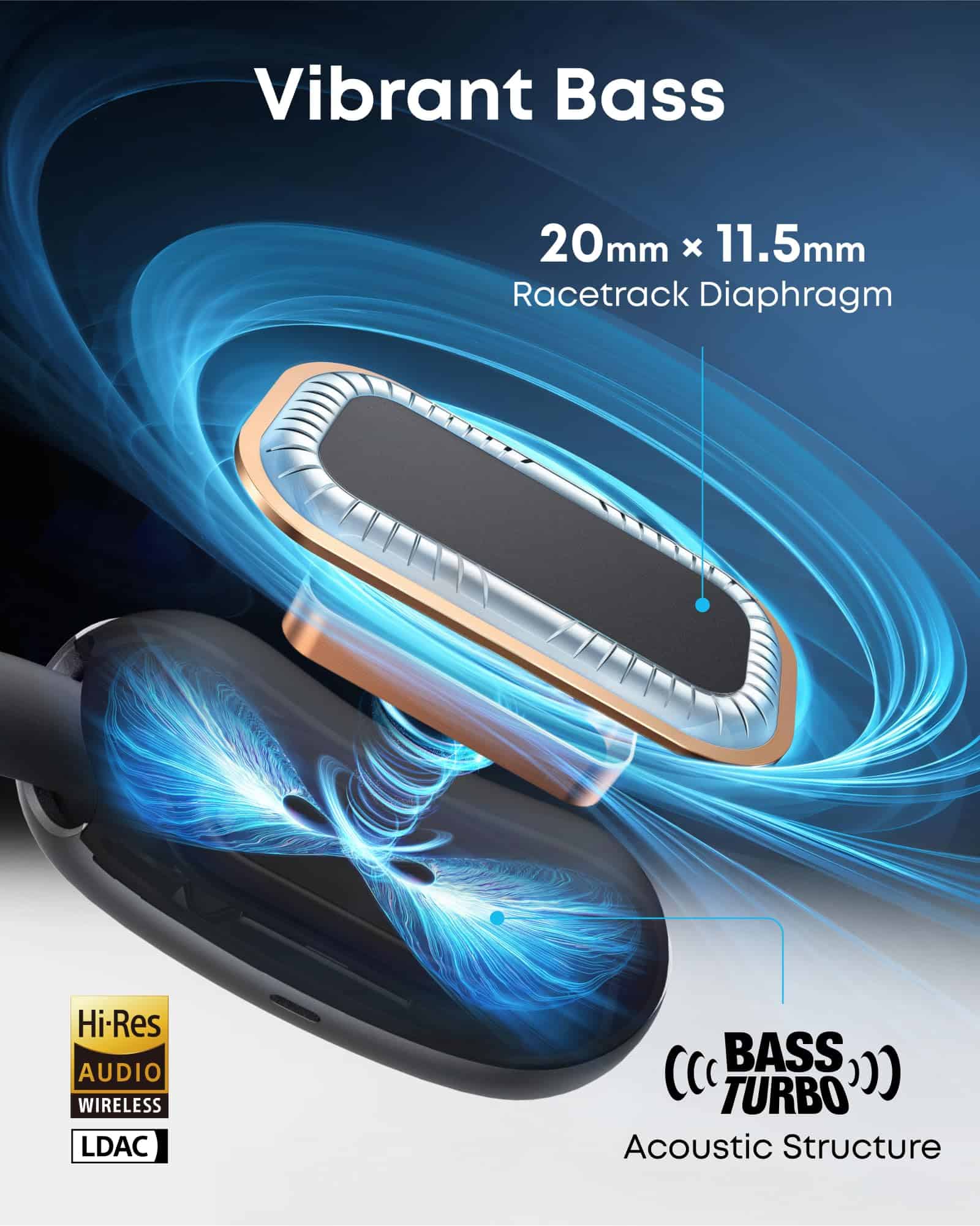 5. Sonido rico: Disfruta de graves profundos, medios claros y agudos vívidos, impulsados por controladores de 20 mm y 11,5 mm y acústica BassTurbo. También es compatible con Bluetooth 5.4 y el códec LDAC para una transmisión de audio estable y de alta resolución.