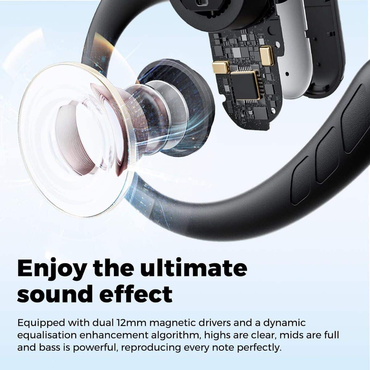 3. Driver de doble imán de 12mm Equipados con un driver de doble imán de 12mm (Titanio PU + PEN) y un algoritmo de mejora de EQ dinámico (controlado a través de la aplicación), los auriculares SoundPEATS Breezy ofrecen agudos cristalinos, medios cálidos y bajos potentes, asegurando una reproducción de sonido fiel a la realidad. A diferencia de los auriculares tradicionales de botón, nuestro diseño de diseño abierto integra tecnología de audio espacial, proporcionando una experiencia cinematográfica inmersiva con el driver de doble imán de 12mm, colocándote en el centro de la acción.