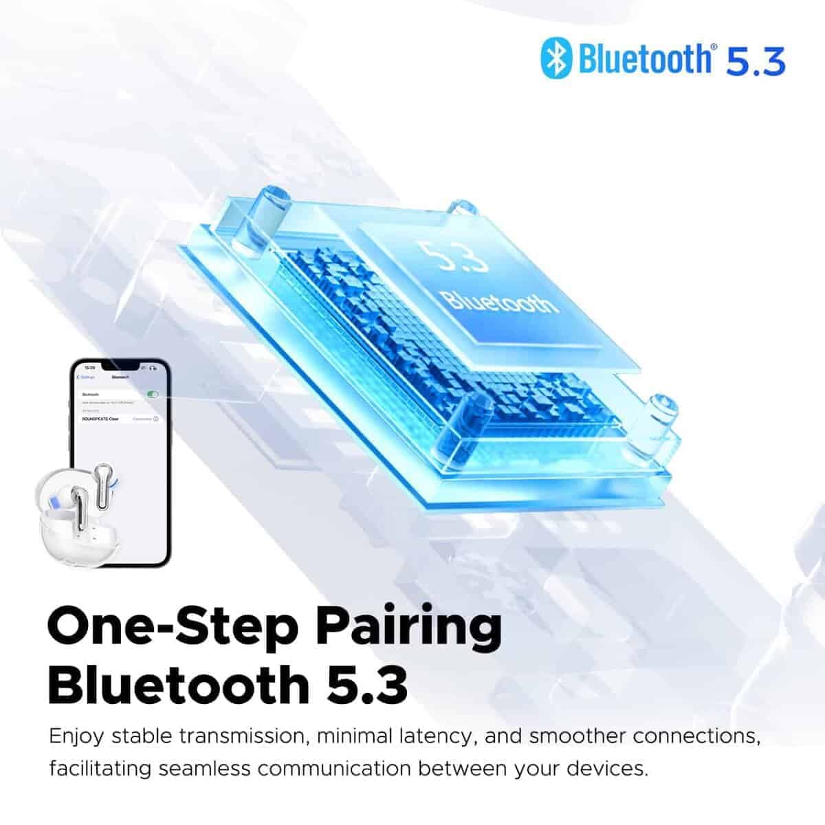 3. Bluetooth 5.3 y Emparejamiento en un Paso – Con la tecnología Bluetooth 5.3, los auriculares SoundPEATS Clear proporcionan conexiones rápidas y confiables para una experiencia auditiva perfecta. Simplemente saca los auriculares del estuche de carga y selecciona «Auriculares SoundPEATS Clear» en la configuración de Bluetooth de tu dispositivo para conectarte automáticamente.