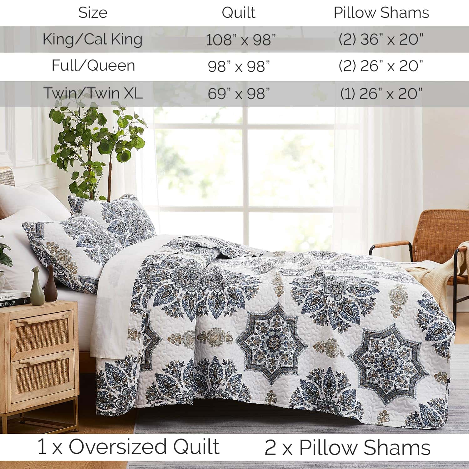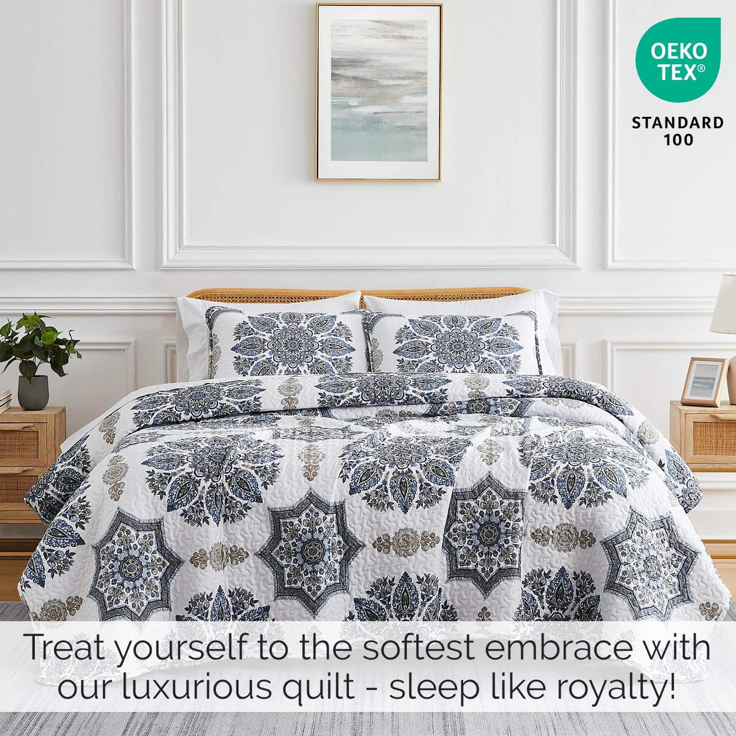 2. El juego de edredón de tamaño completo/reina es un juego de 3 piezas que contiene un edredón: 98 pulgadas de ancho x 98 pulgadas de largo y dos fundas de almohada acolchadas: 20 pulgadas de ancho x 26 pulgadas de largo. Tanto los edredones como las fundas de almohada están acolchados en ambos lados. Las fundas tienen un cierre de sobre que esconde por completo tus almohadas. Ofrecemos cientos de opciones y un servicio al cliente altamente enfocado en el cliente. Estos cubrecamas de tamaño king extragrandes son ligeros.