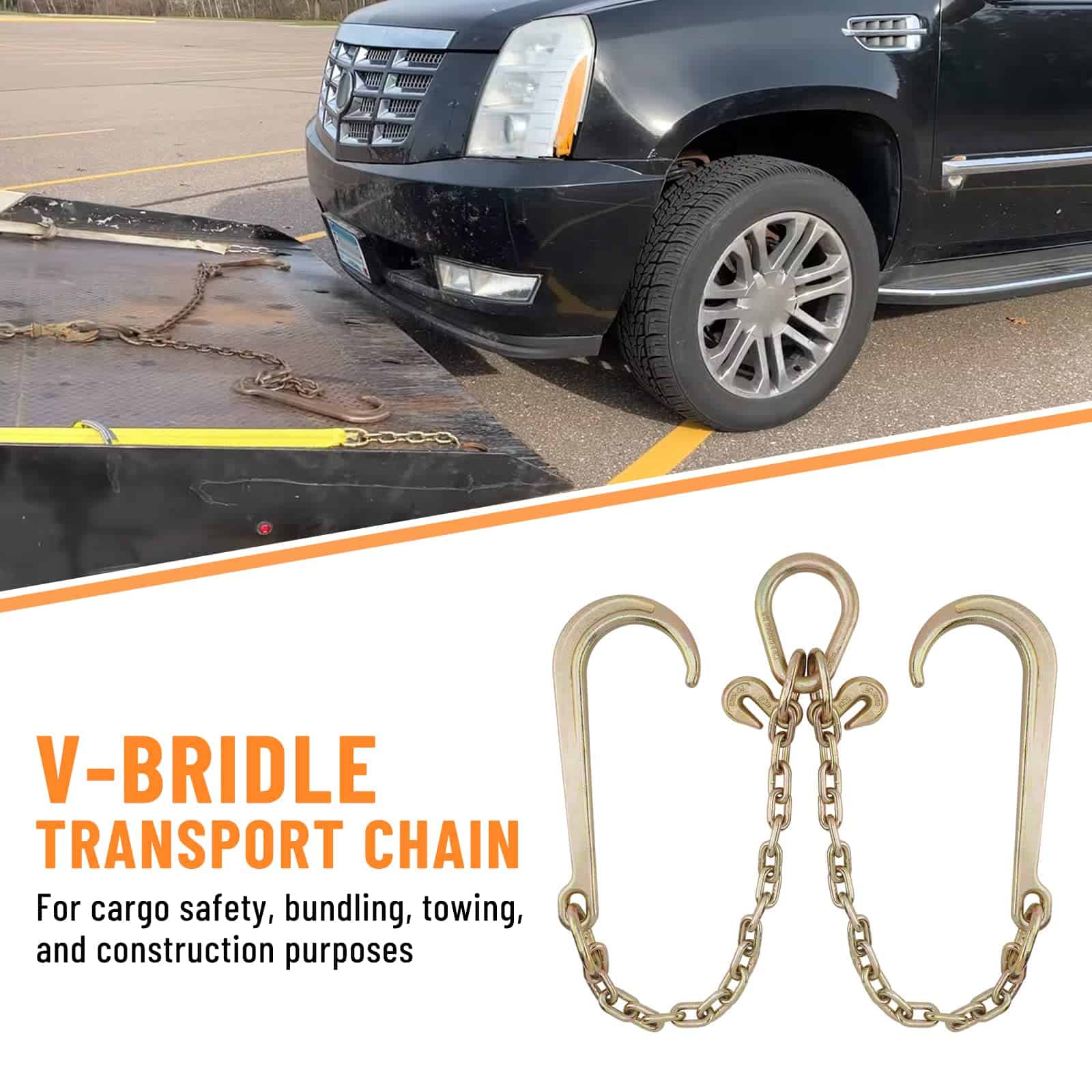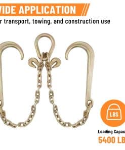 SPARKWHIZ G70 J Hook Tow Chain V Bridle con ganchos J de 15″, ganchos de 5/16», patas de 2 pies, cadenas de seguridad para camiones de plataforma 5,400 lbs es una herramienta imprescindible para cualquier profesional que necesite un sistema de transporte seguro y confiable. Fabricado en acero de aleación con recubrimiento de zinc, este conjunto de cadenas de gancho J es resistente a la oxidación y la corrosión, lo que garantiza una larga vida útil y un rendimiento confiable. Con un límite de carga de trabajo de 5,400 lbs por cadena con gancho y una capacidad total de 18,800 lbs, estas cadenas son robustas y confiables para una variedad de aplicaciones.