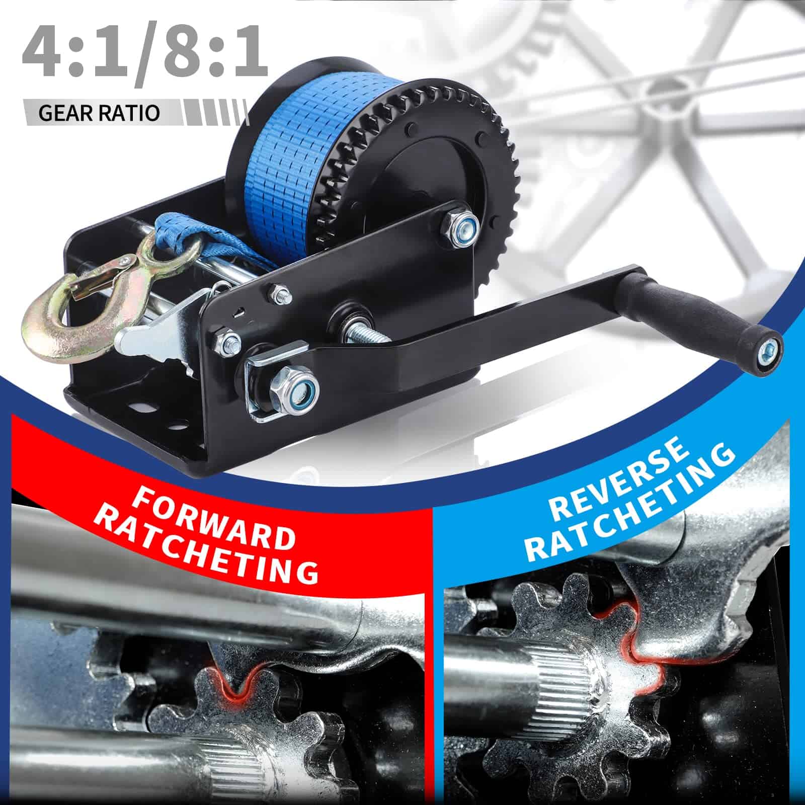 El diseño ergonómico con manija antideslizante garantiza una operación segura y cómoda. La función de trinquete de dos vías permite un uso fácil tanto hacia adelante como hacia atrás. Perfecto para camiones, remolques, ATV, carga / remolque de barcos y más.