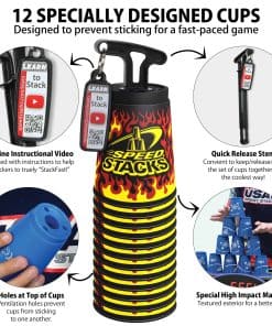Speed Stacks son tazas de apilamiento de alta tecnología especialmente diseñadas y respaldadas por la Asociación Mundial de Deportes de Apilamiento (WSSA) para competición. Cada juego viene con su propio vástago sostenedor y nuestras geniales instrucciones de apilamiento en línea, que incluyen aspectos destacados de los Campeonatos Mundiales y técnicas de apilamiento para ayudarte realmente a «Apilar Rápido».