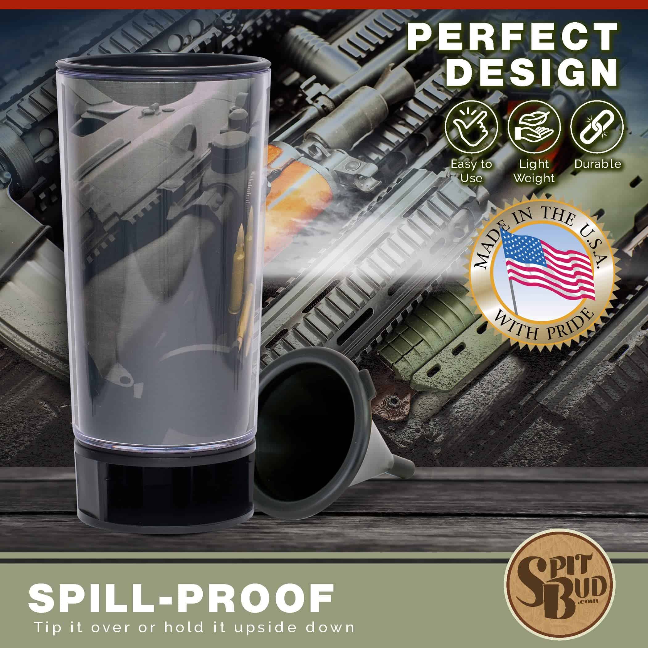Nunca te preocupes por hacer un desastre. El Spit Bud cuenta con una tapa virtualmente a prueba de derrames. Cerrado completamente, el vaso mantendrá el líquido securamente contenido dentro, incluso si lo sostienes boca abajo. Utiliza el compartimento inferior especial para sostener fácil y discretamente tus latas de tabaco.