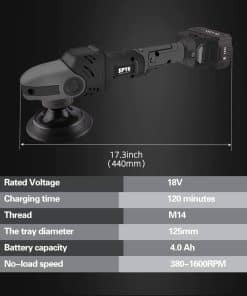 Parámetro Técnico: Voltaje y Frecuencia: 110V / 60Hz Potencia de Entrada Nominal: 850W / 7A Velocidad sin Carga: 2000-6400 RPM Órbita: 9mm Diámetro de la Placa: 6″ (150mm) / 5″(125mm) Peso Neto: 2.0KG Ventajas del Producto: Velocidad Variable y Seis Ajustes de Velocidad: Seis ajustes de velocidad de 2000-6400 rpm para pulir, pulir y lijar vehículos, coches, motos, barcos, cocina, azulejos de baño y más, puede seleccionar diferentes velocidades cuando hace diferentes trabajos. Eficiencia de Entrega Alta y Motor Poderoso: La velocidad de salida rotatoria va desde 2000 hasta 6400 rpm, con un ajuste oportuno y una salida de fuerza de par poderosa, siempre produce y mantiene una velocidad constante. Cuerpo Ligero y Tamaño Pequeño: El peso neto de la pulidora es solo de 2.0 kg, adecuado para todo tipo de personas, menos fatiga y alivio del dolor, evita dejar caer la pulidora pesada sobre el coche y causar daños. Consejos Amables: Para proteger su seguridad y prolongar la vida útil de la herramienta, preste especial atención a los siguientes asuntos. 1. Mantenga el lugar de trabajo limpio y con iluminación adecuada. Antes de operar, examine cuidadosamente y vea si hay alguna grieta o daño. 2. La tensión de las herramientas no debe exceder el 10% del rango de voltaje nominal. 3. No se permite que personal no profesional desmonte o repare herramientas. Lo que Obtendrás: 1 x Almohadilla de Espuma Plana Blanca de 6″(150mm) 1 x Almohadilla de Espuma Plana Negra de 6″(150mm) 1 x Almohadilla de Espuma Plana Azul de 6″(150mm) 1 x Almohadilla de Espuma en Ondas Verde de 6″(150mm) 1 x Almohadilla de Espuma en Ondas Amarilla de 6″(150mm) 1 x Almohadilla de Espuma en Ondas Roja de 6″(150mm) 1 x Almohadilla de Espuma en Ondas Negra de 6″(150mm) 1 x Almohadilla de Espuma Diamante Azul de 6″(150mm) 1 x Almohadilla de Espuma Diamante Amarilla de 6″(150mm) 1 x Almohadilla de Espuma en Ondas Verde de 5″(125mm) 1 x Almohadilla de Espuma en Ondas Amarilla de 5″(125mm) 1 x Placa de Respaldo de 5″(125mm) 1 x Placa de Respaldo de 6″(150mm) 1 x Almohadilla de Lana de 6″(150mm) 1 x Guante de Lana para Lavado 2 x Paño de Microfibra 1 x Mango de Pulidor 2 x Llave