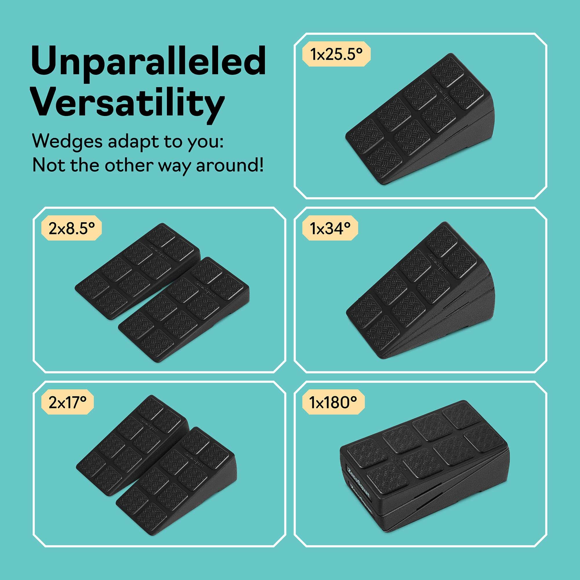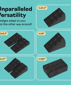 1. COMBINACIÓN DE ÁNGULOS! Utilice las cuñas como una tabla inclinada para sentadillas (talones levantados) o como un estirador de pantorrillas inclinado (dedos de los pies levantados). Eleve ambos pies a 8.5 o 17 grados, o solo un pie a los 34 grados completos, para ampliar progresivamente su rango de movimiento.