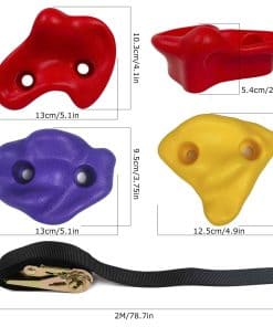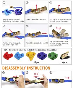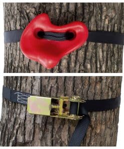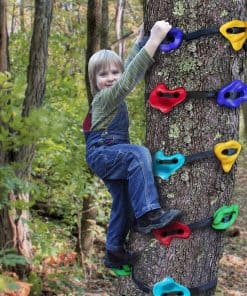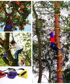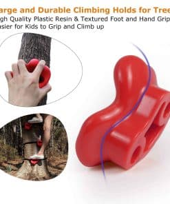 Utilice estos agarres como acceso fácil a una fortaleza en un árbol, o simplemente para divertirse escalando! Fáciles de instalar, las correas se envuelven alrededor de los troncos de los árboles, se enganchan en la corteza y se bloquean en su lugar con clips de manivela. ¡Haz que los niños se emocionen por salir y jugar al aire libre! Se requiere supervisión e instalación de adultos. Peso máximo: 200 lbs.