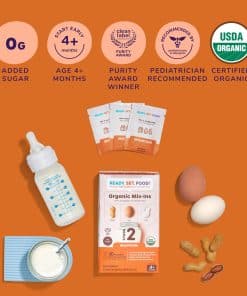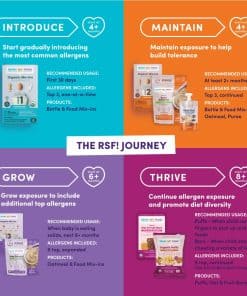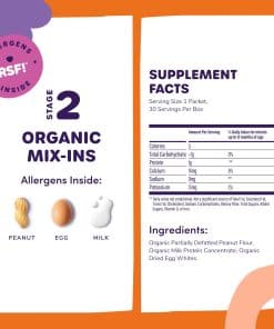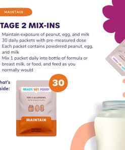 Safe & Easy Early Allergen Introduction for Babies – Safely introduce your infant to the 3 top baby food allergens with our powdered eggs, peanut, and milk daily packets. Per doctor recommendations, our Stage 2 system offers continued low-dose exposure following introductions at Stage 1. Each individual packet is made with simple ingredients: organic peanut, egg, and milk, and can be added to a bottle or infant food. The NIH, USDA & FDA all recommend that kids under 2 not be given ANY added sugars. Just real, organic food. Ready. Set. Food! Stage 2 Mix-ins make maintaining allergen exposure simple and stress-free. Daily pre-measured packets, labeled Day 1 to 30, can be added to your infant baby food or bottle. Made by an allergist-mom of 2, our system follows USDA & pediatrician-recommended guidelines for early and gradual baby allergen introduction using the same allergens & amounts used in clinical trials. Ready. Set. Food! offers a research-based, 4-stage system to introduce your little one to the most common allergens, maintain their exposure to build tolerance, grow exposure to additional allergens, and thrive through continued exposure and diet diversity! This product is not intended for use by infants who have been diagnosed with food allergies.