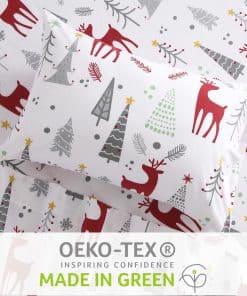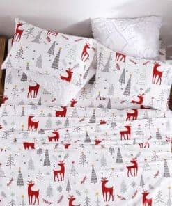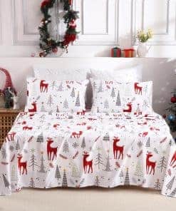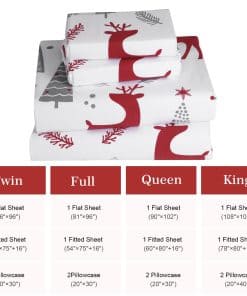 El diseño navideño de estas sábanas agrega un toque festivo a tu dormitorio con un patrón de árboles de Navidad rojos sobre un fondo blanco, lo que las convierte en la elección ideal para las vacaciones. Úsalas para darle un ambiente festivo a tu habitación o regálalas a tus seres queridos para compartir la alegría navideña.