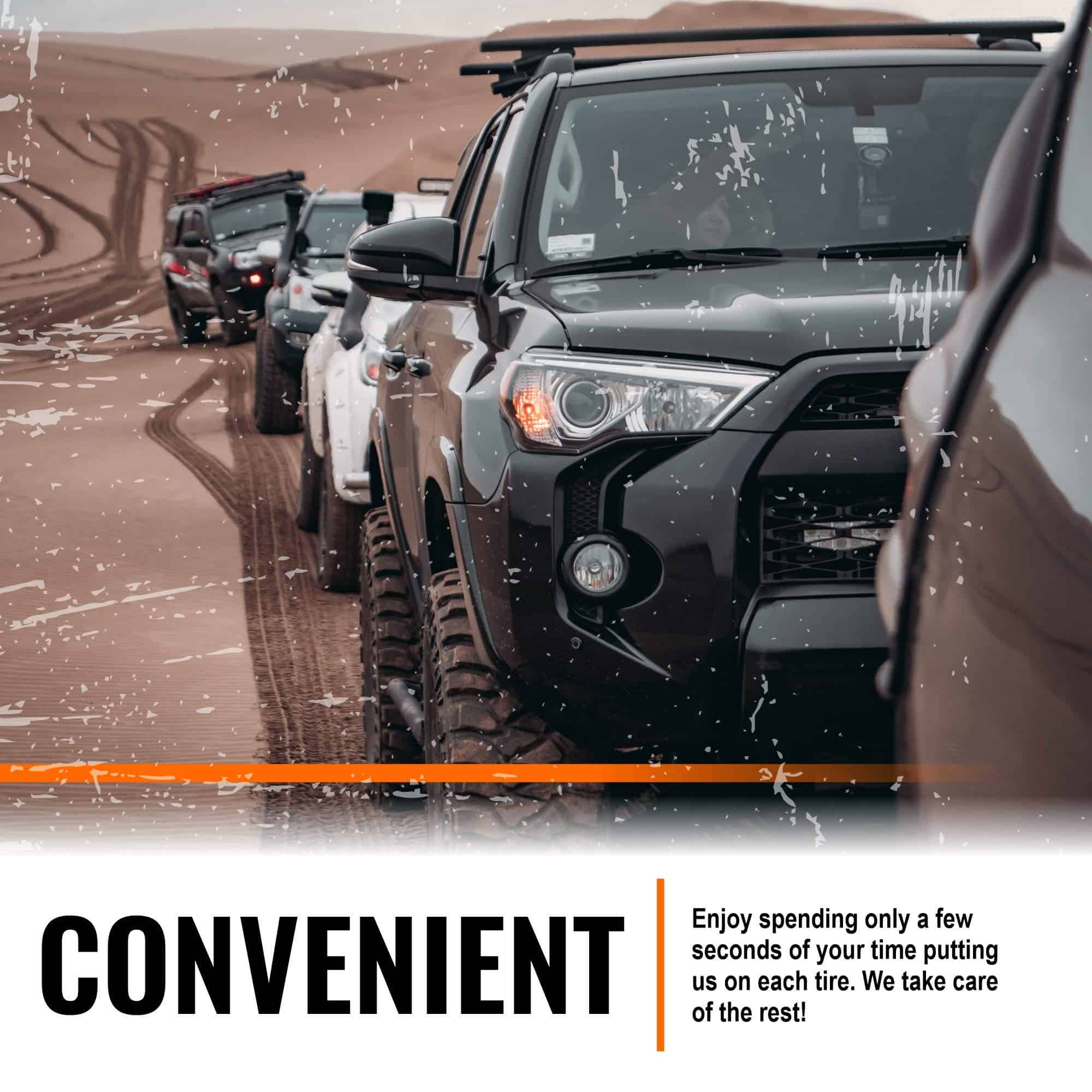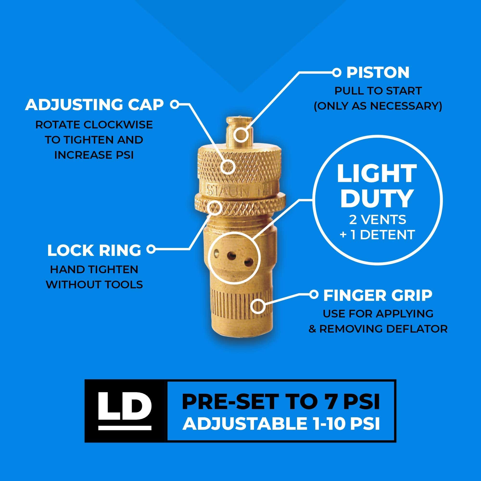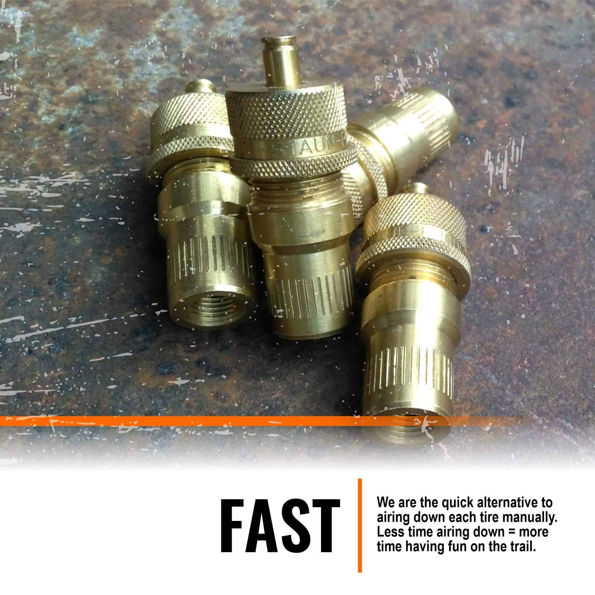 «GARANTIZADO PARA DEJARLO ABAJO» Los desinfladores de neumáticos Staun son la manera fácil de desinflar sus neumáticos para aumentar la tracción fuera de la carretera. Simplemente atornille en la válvula del neumático para desinflar automáticamente todos los neumáticos a la presión preestablecida. Simplemente atornille la válvula en el vástago de la válvula y retírese. Los desinfladores harán el resto. Una vez que haya preestablecido la válvula, no tendrá que volver a configurarla, a menos que desee cambiar la configuración de la presión. La solución perfecta para desinflar sus neumáticos para aumentar la tracción en superficies todoterreno.