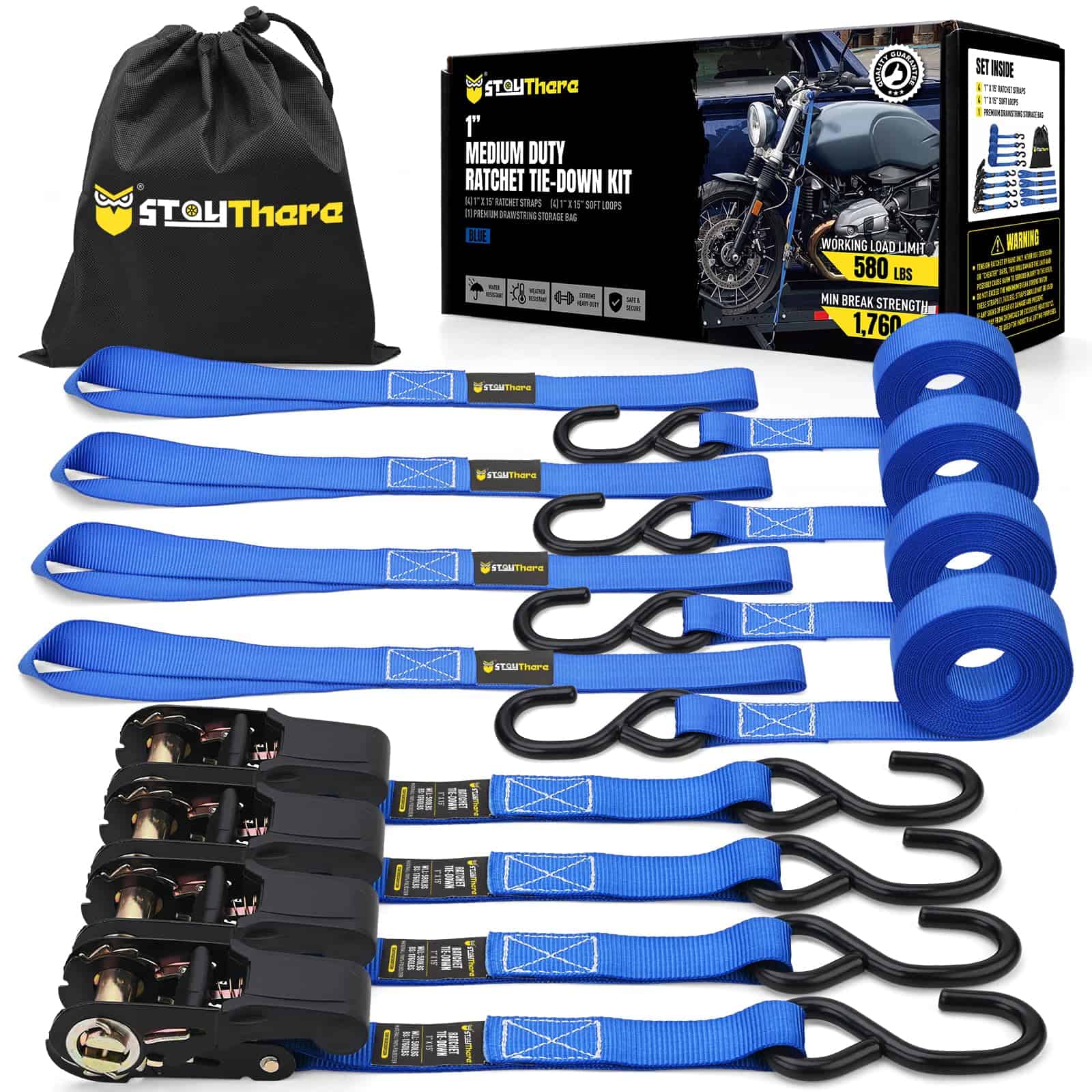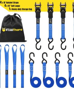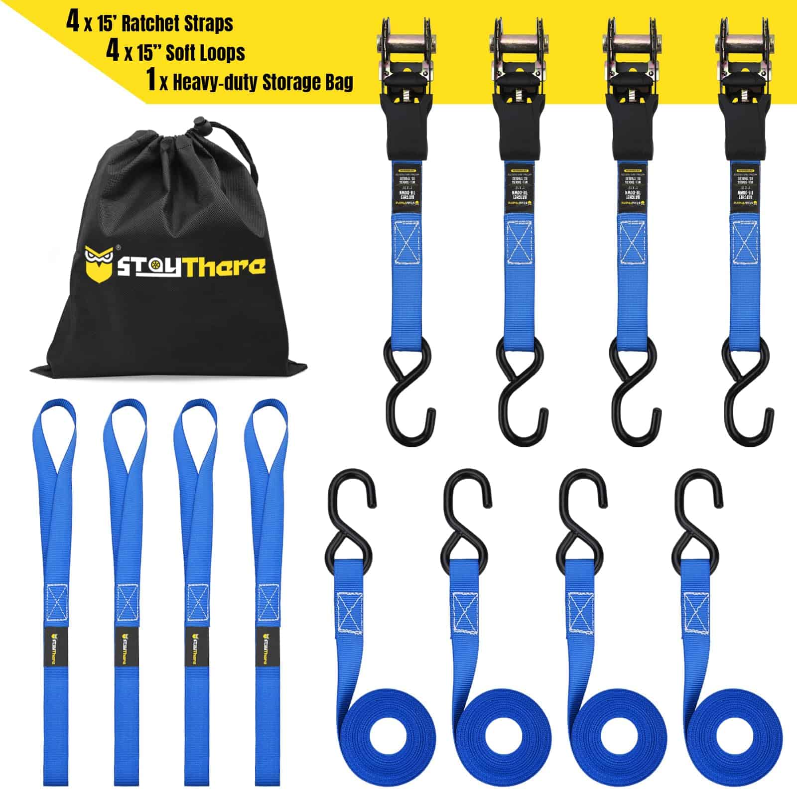 2. Cintas con Trinquete 4 Pack: Las cintas con trinquete están hechas de una cinta de poliéster duradera de 1 pulgada de ancho con un patrón de costura resistente y tienen una resistencia a la rotura probada en el laboratorio de 1760 libras. Este set de cintas con trinquete incluye 4 hebillas de trinquete de metal con agarres de goma, 4 correas con lazos suaves, 4 correas con ganchos en S resistentes. Las correas tienen 1 pulgada de ancho y 15 pies de largo. Todo cabe dentro de una bolsa de transporte.