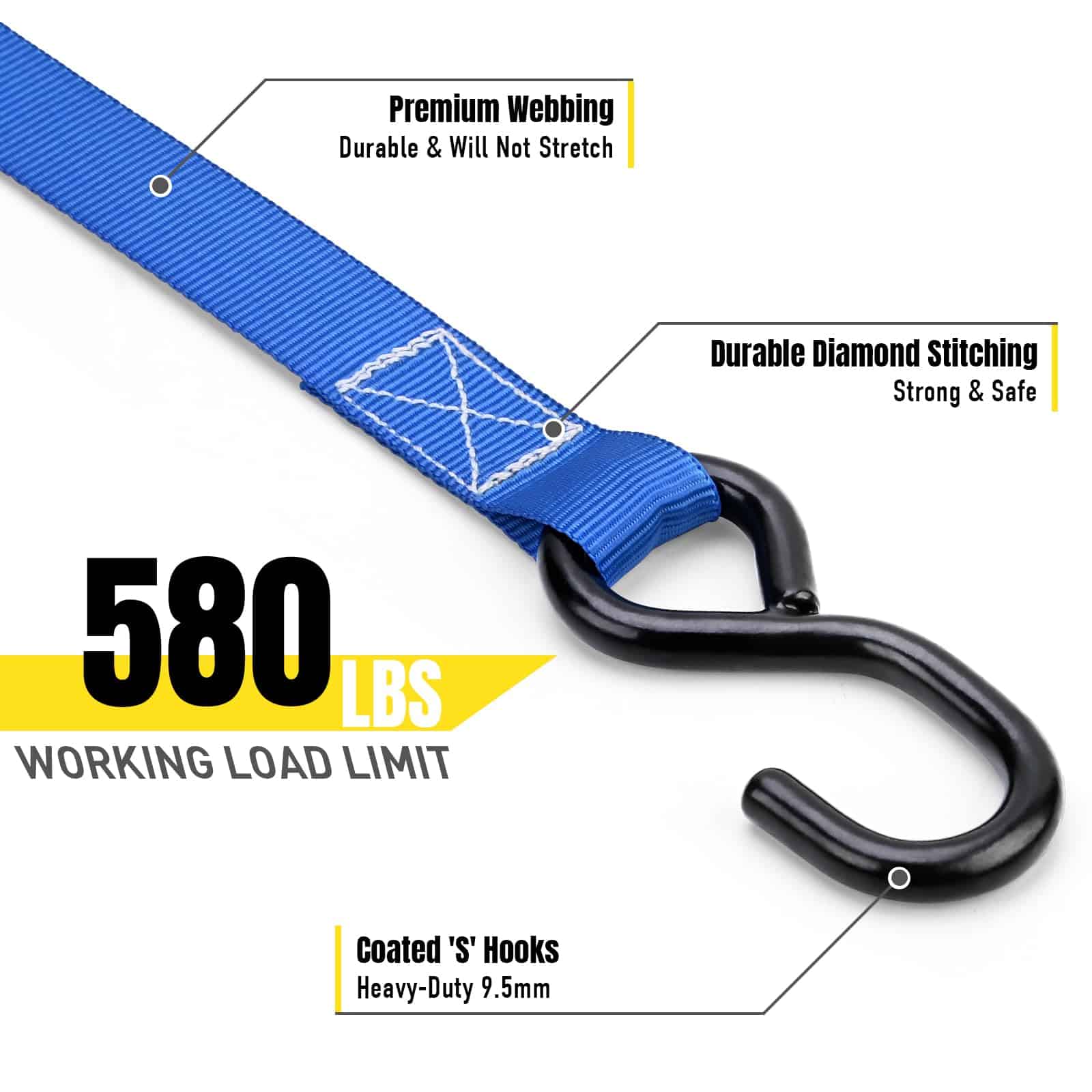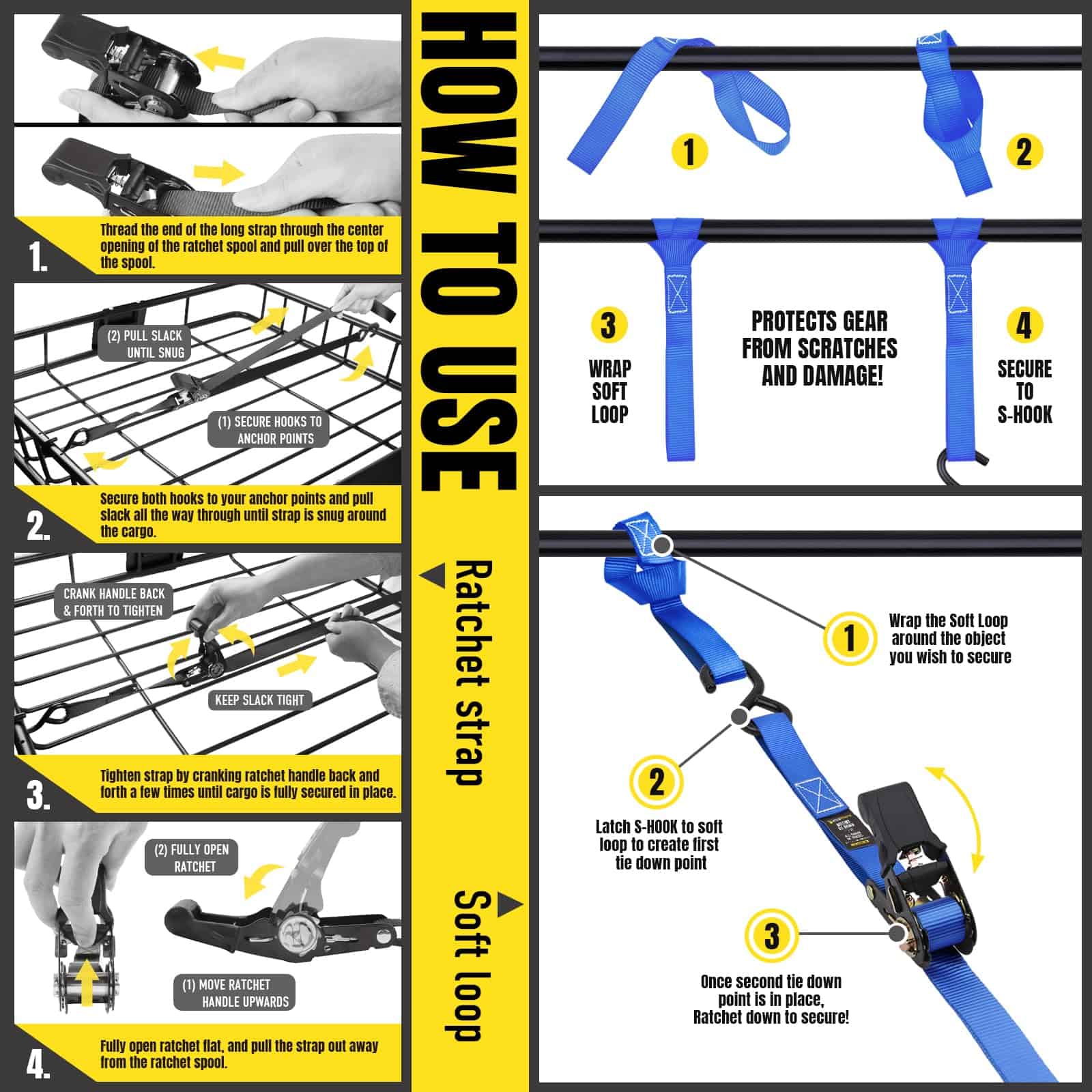 3. FÁCIL Y RÁPIDO DE USAR: Los ganchos en S resistentes de las correas con trinquete y las correas con lazos suaves ayudan a crear puntos de anclaje para asegurar artículos a automóviles, camionetas y camiones. Los mangos ergonómicos con agarre de goma facilitan la sujeción mientras se trinca para asegurar sus cargas de forma segura durante el transporte.