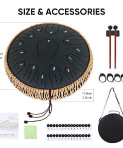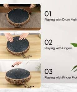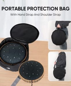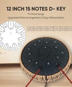1. 15 Notas Amplio Rango y Fácil de Tocar: Amplia gama de tonos para tocar canciones más complejas. 7 series de secuencias de escalas diseñadas por músicos profesionales para satisfacer las necesidades de interpretación profesional, y los principiantes pueden aprender a tocar fácilmente. La steel tongue drum de 15 notas en tono mayor D se puede tocar con mazos o dedos. El tono es hermoso, claro y melódico, superando las deficiencias de la pequeña handpan drum con tono plano. 2. Sonido Etéreo: Cada nota en la steel tongue drum tiene un tono etéreo y puro, creando una atmósfera melódica y tranquila. La escala tonal en clave de D, específicamente, agrega una sensación de enraizamiento y estabilidad al sonido general. 3. Excelente Producción: Con acero de alta calidad y aleación de titanio, se siente cómodo en la mano. La superficie del tambor de acero está pintada con un proceso de laca no contaminante y no desvaneciente para mayor durabilidad. El borde de la steel tongue drum etérea con goma envolvente antideslizante extraíble y cuerda tejida a mano es muy elegante y generoso. 4. Set de Steel Drum Perfecto: steel tongue drum de 12 pulgadas, bolsa de tambor (correa para el hombro incluida), baquetas, púas de dedo, pegatinas de notas de repuesto, partituras, soporte para baquetas, paño de limpieza. Tambor de meditación perfecto, fácil de disfrutar de la música. 5. Ampliamente Utilizado y Excelentes Regalos: Útil para la iluminación musical, acompañamiento de conciertos, meditación de yoga, meditación sentada, actividades religiosas, entretenimiento familiar, reuniones de amigos y entretenimiento en viajes. Regalos para niños, familia, amigos y amantes de la música para cumpleaños, Navidad y Año Nuevo. Este relajante steel drum puede ayudar a aliviar el estrés, relajarse e inspirar a otros a interesarse por la música.