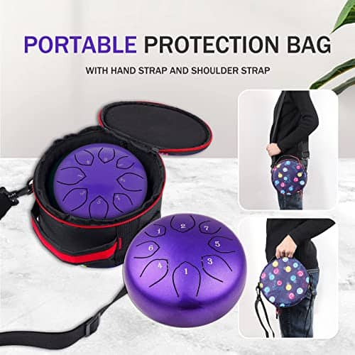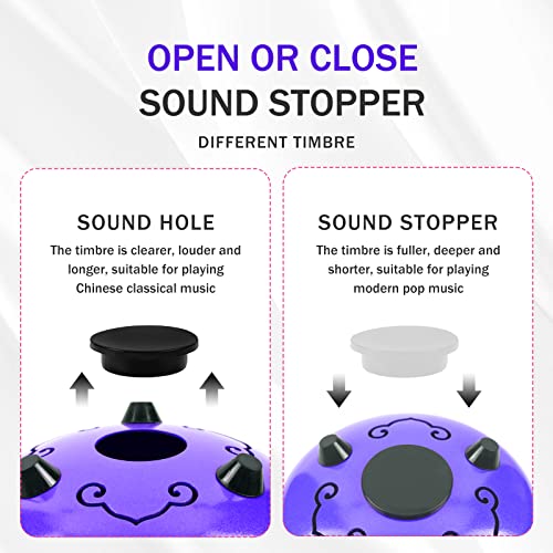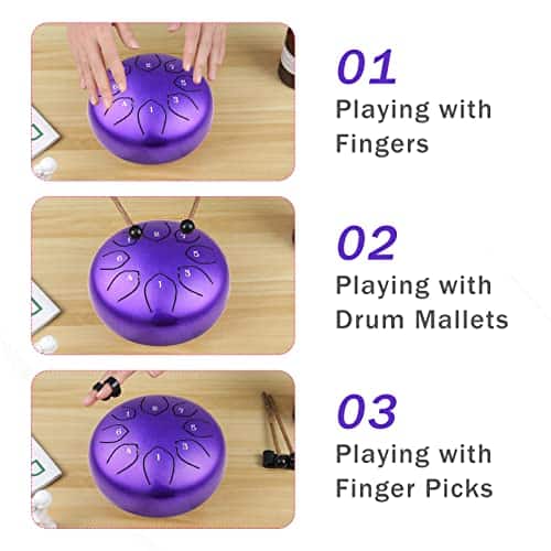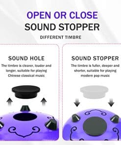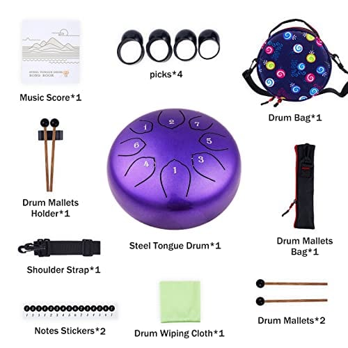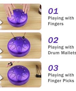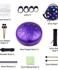 Características: El tambor de acero Musfunny está hecho a mano por artesanos profesionales. El sonido es muy agradable y es un tipo de sonido similar a las tonos de Buda. El tambor de lengua tiene un rango adecuado de sonido, adecuado para una variedad de campos, como la educación musical, conciertos de percusión, sanación de la mente, meditación de yoga. Un tope de sonido en la parte posterior puede cambiar el timbre del tambor de lengua de acero. Cuando se instala el tope de sonido, el timbre es más completo y profundo, la nota sostenida es corta, adecuada para tocar música pop moderna. Cuando se desmonta el tope de sonido, el timbre es más claro, más alto y más largo, adecuado para tocar música clásica. Métodos de disfrutar: Usando las manos o mazas. Tocarlo con las manos requiere estándares más altos de fuerza de manos y una posición de golpeo más precisa, por lo tanto, usar mazas es tu primera opción (especialmente para los novatos). El sonido bajo las mazas será más penetrante, más puro y más etéreo. Sosteniendo la maza 1/3 y golpeando el centro de la cabeza de la lengua, obtendrás el sonido perfecto. Si al tocarlo sale algo de «ruido», en su mayoría se debe a que se está golpeando en un lugar incorrecto. Especificaciones: Tamaño del tambor: 6 pulgadas Color: Negro / Morado / Azul (opcional) Material: Aleación de acero Tamaño del artículo: 15.2 9.4cm / 5.98 3.7in Peso del artículo: 580g / 20.46oz Tamaño del paquete: 23.5 22.5 14.5cm / 9.25 8.86 5.71in Peso del paquete: 1060g / 37.39oz Lista de paquetes: 1 Tambor de lengua de acero 1 Bolsa de tambor 1 Correa para el hombro 2 Mazas de tambor 1 Soporte para mazas de tambor 1 Bolsa para mazas de tambor 1 Paño de limpieza de tambor 1 Partitura de música