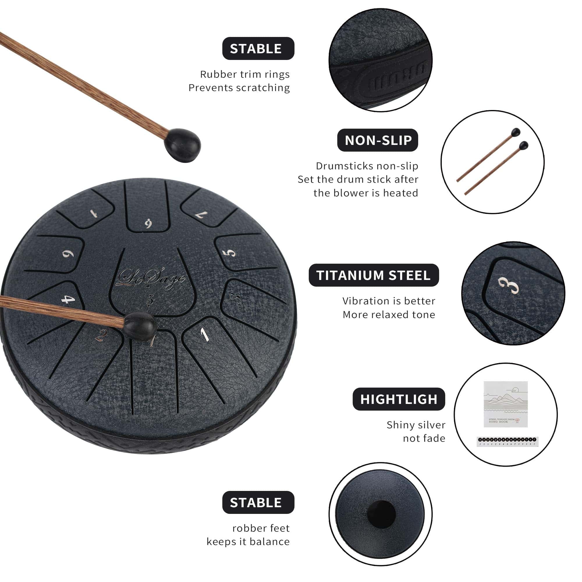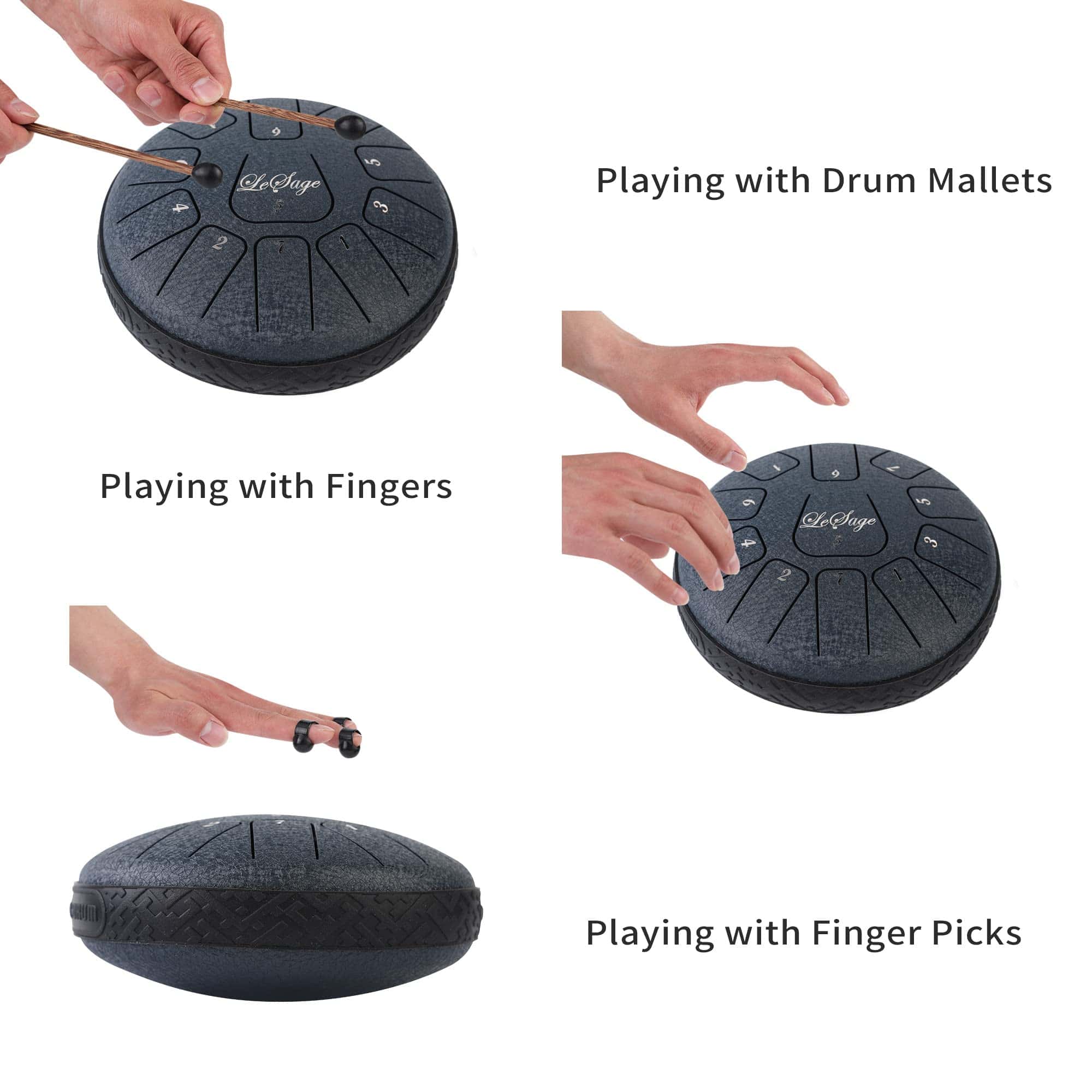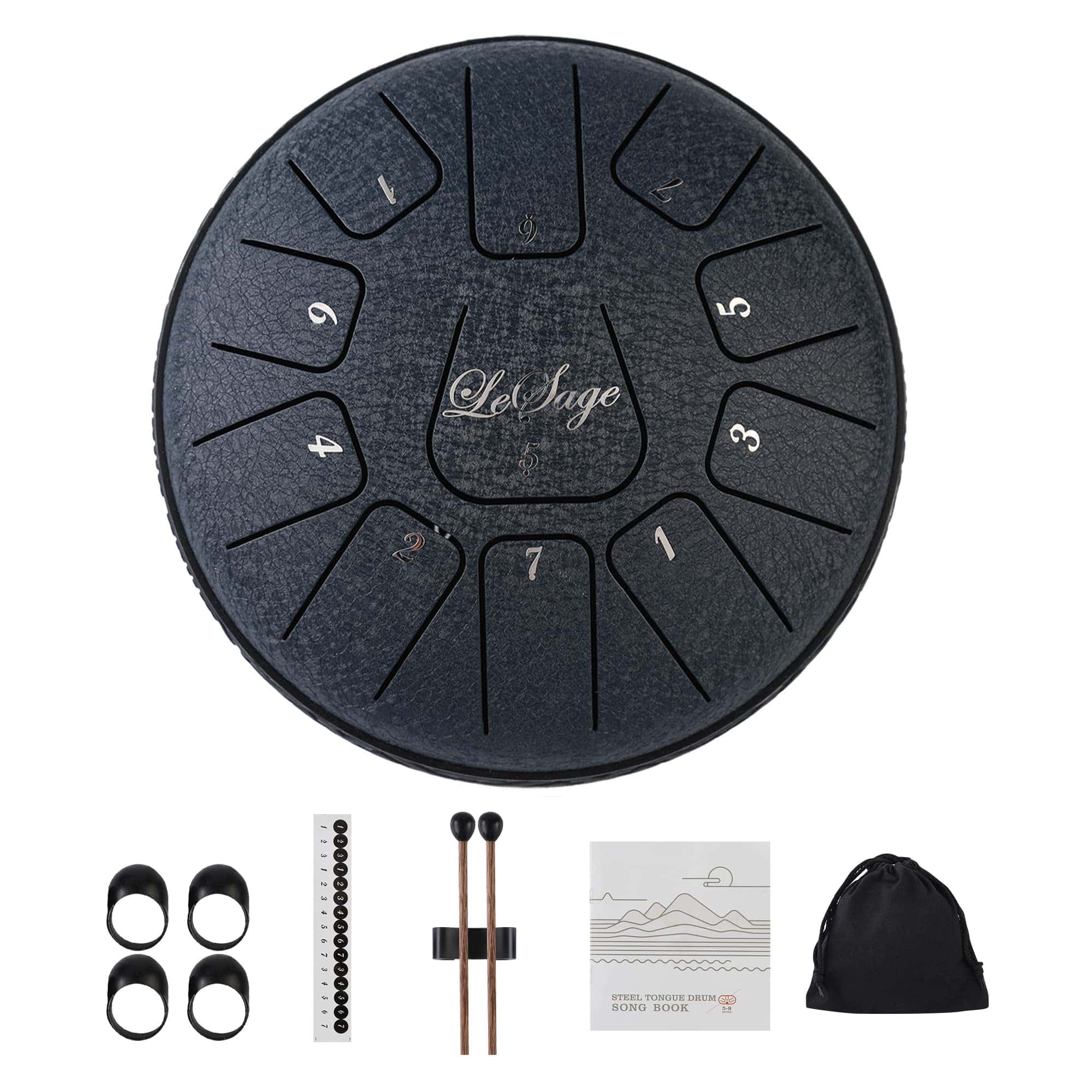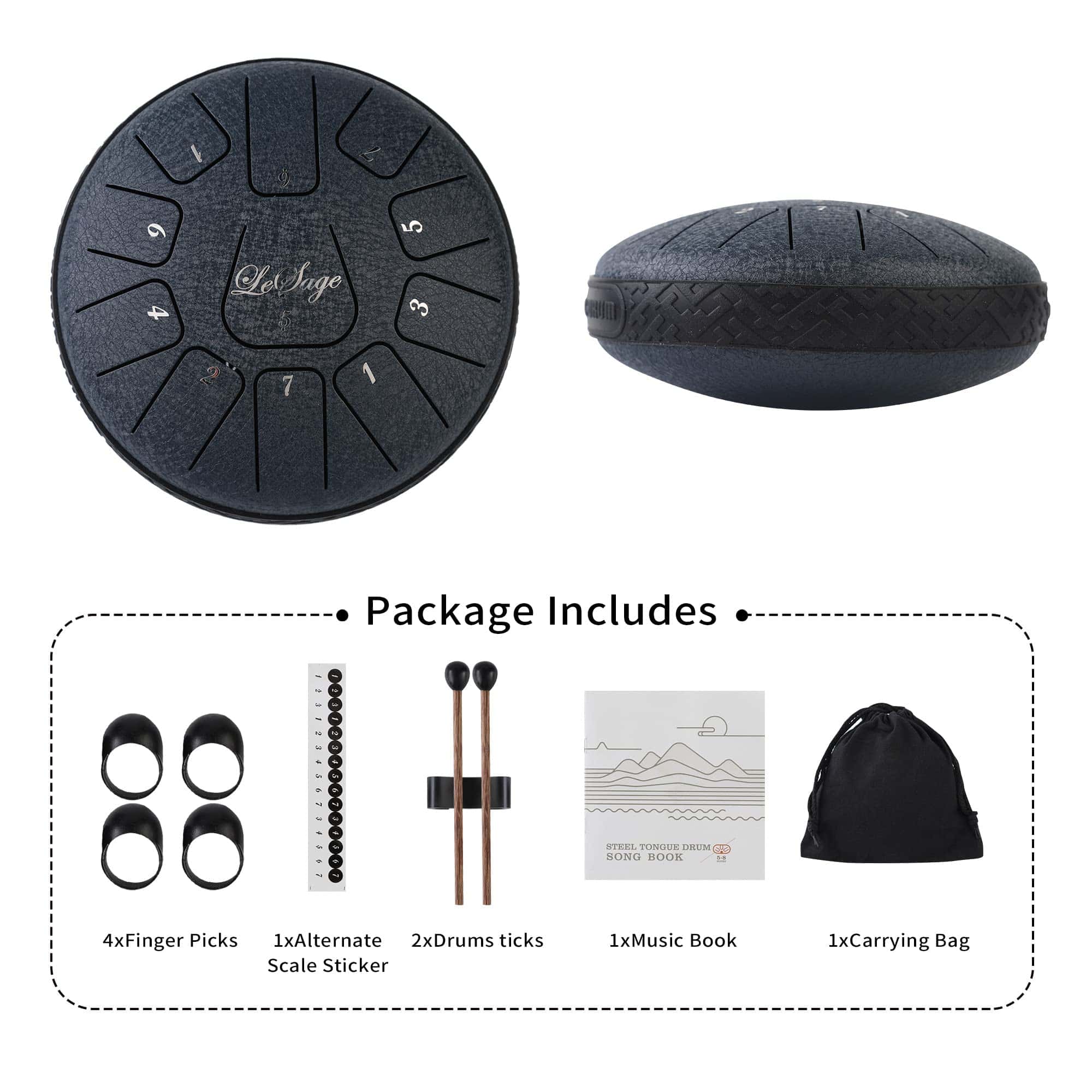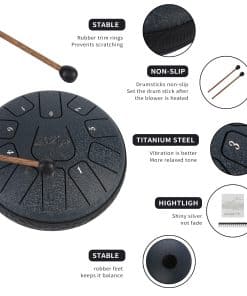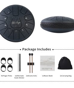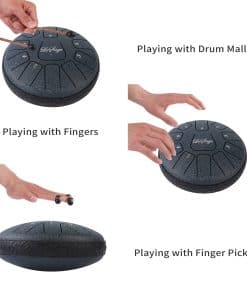 1.El tambor de acero tiene un rango más amplio de 11 tonos 6 en Re mayor y está hecho de una aleación de acero. El tambor de lengua se puede adaptar a muchas ocasiones, se puede utilizar para el acompañamiento de conciertos, meditación de yoga, educación en iluminación musical, rehabilitación espiritual, el tambor tiene un hermoso sonido, suave, volumen moderado, melodía clásica y relajante que puede aliviar el estrés y hacer que te relajes lentamente. 2.El LeSage Steel Tongue Drum tiene una notable riqueza de sonidos y con una afinación perfecta, te permite descubrir armónicos cautivadores y meditativos adecuados para sesiones de relajación, despertar musical y talleres de terapia musical. 3.El tambor de lengua se puede adaptar a muchas ocasiones, se puede utilizar para el acompañamiento de conciertos, meditación de yoga, educación en iluminación musical, rehabilitación espiritual, el tambor tiene un hermoso sonido, suave, volumen moderado, melodía clásica y relajante que puede aliviar el estrés y hacer que te relajes lentamente. Tocar nuestro Tambor de Lengua con tus seres queridos significa tiempo de calidad y una excelente manera de reunirse y olvidarse del estrés diario de la vida moderna. 4.Los tambores de lengua se pueden tocar sentado o de pie cuando se colocan en una mesa o una superficie adecuada. Los niños más grandes y las personas mayores también pueden colocar y tocar tambores en sus muslos mientras están sentados. 5.Paquete incluye un par de mazos de tambor, 4 púas para dedo, libro de música, 2 pegatinas de tono y bolsa de almacenamiento.