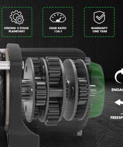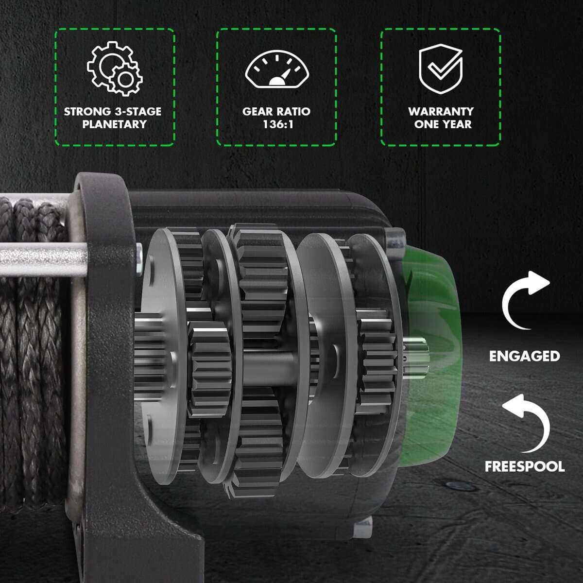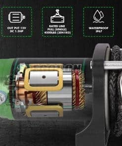 Marca: STEGODON Color: Negro/Verde Cuerda: Cuerda Sintética de 50 pies (Negra) Capacidad de Carga Nominal: 4500 lb (2041 kg) en una sola línea Dimensiones: Largo x Ancho x Alto 15.8″ x 4.6″ x 4.7″ Motor: Motor DC de imán permanente de 12V con una potencia de 1.9hp/1.5kw Relación de reducción de engranajes: 198:1 Peso: 28 lb Nivel de Sonido: 85dB Calificación IP: IP66: Cabrestante y controles (excepto interruptor remoto) Longitud del cable: 5.5mm x 50 pies Control: Controles inalámbricos con cable Control de la Carga: Control de Autosujeción Mecánica Ciclo de Trabajo Nominal: 5% (45 seg a Carga Máx Nominal; 14 min, 15 seg Reposo) Accesorios Incluidos: 1 x Interruptor Remoto. 1 x Control Remoto Resistente. 1 x Guía de Cabrestante de Aluminio. 1 x Gancho Forjado en Martillo. 1 x Placa de Montaje. 1 x Caja de Control. 4 x Cables. 1 x Accesorios Descripción del Artículo: Cuerda Sintética rentable Entrada y salida de potencia Placa de Montaje de Cabrestante de bonificación Control Remoto con cable e inalámbrico Control de Autosujeción Mecánica No tire de toda la cuerda al usarla. Detenga la extracción cuando se exceda la línea de advertencia.