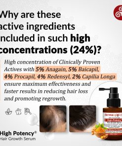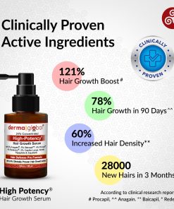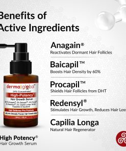 ¿Tienes problemas de adelgazamiento capilar o caída obstinada del cabello El Suero Capilar de Alta Potencia Derma Global es tu solución avanzada y basada en plantas. Este suero cuenta con una fórmula de fuerza clínica con una concentración activa del 24%, incluyendo un 5% de Anagain, 5% de Baicapil, 4% de Procapil, Redensyl y un 2% de Capilia Longa ingredientes respaldados por la investigación y los resultados. La fórmula Hair Defence Pro trabaja directamente en las causas raíz de la pérdida de cabello reactivando folículos inactivos, impulsando la producción de colágeno y mejorando la circulación del cuero cabelludo. Enriquecido con Queratina, Péptidos de Cobre, Biotina, Cafeína, Niacinamida y una potente mezcla de aceites vegetales y extractos botánicos, proporciona nutrición en profundidad al cuero cabelludo para fortalecer y engrosar cada mechón desde adentro. Suave pero efectivo, este suero es no graso, fácil de aplicar e ideal tanto para hombres como mujeres. Agítalo bien, rocía sobre el cuero cabelludo limpio y seco y masajea suavemente no es necesario enjuagar. Con el uso regular, espera menos caída en 30 días, nuevos cabellos en 60 días y volumen visible en 90-180 días. Ya sea que te enfrentes a una caída postparto, adelgazamiento estacional o signos tempranos de calvicie, el Suero Capilar de Crecimiento Derma Global es tu solución para un cabello más grueso, más lleno y más saludable de forma natural.