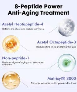 Este suero de péptidos está formulado para mantener un brillo juvenil y radiante en la piel, gracias a su acción como bloques de construcción para el colágeno, retrasando así los signos visibles del envejecimiento. Además, el suero está enriquecido con ácido hialurónico y otros ingredientes activos para maximizar los efectos revitalizantes en el cutis.