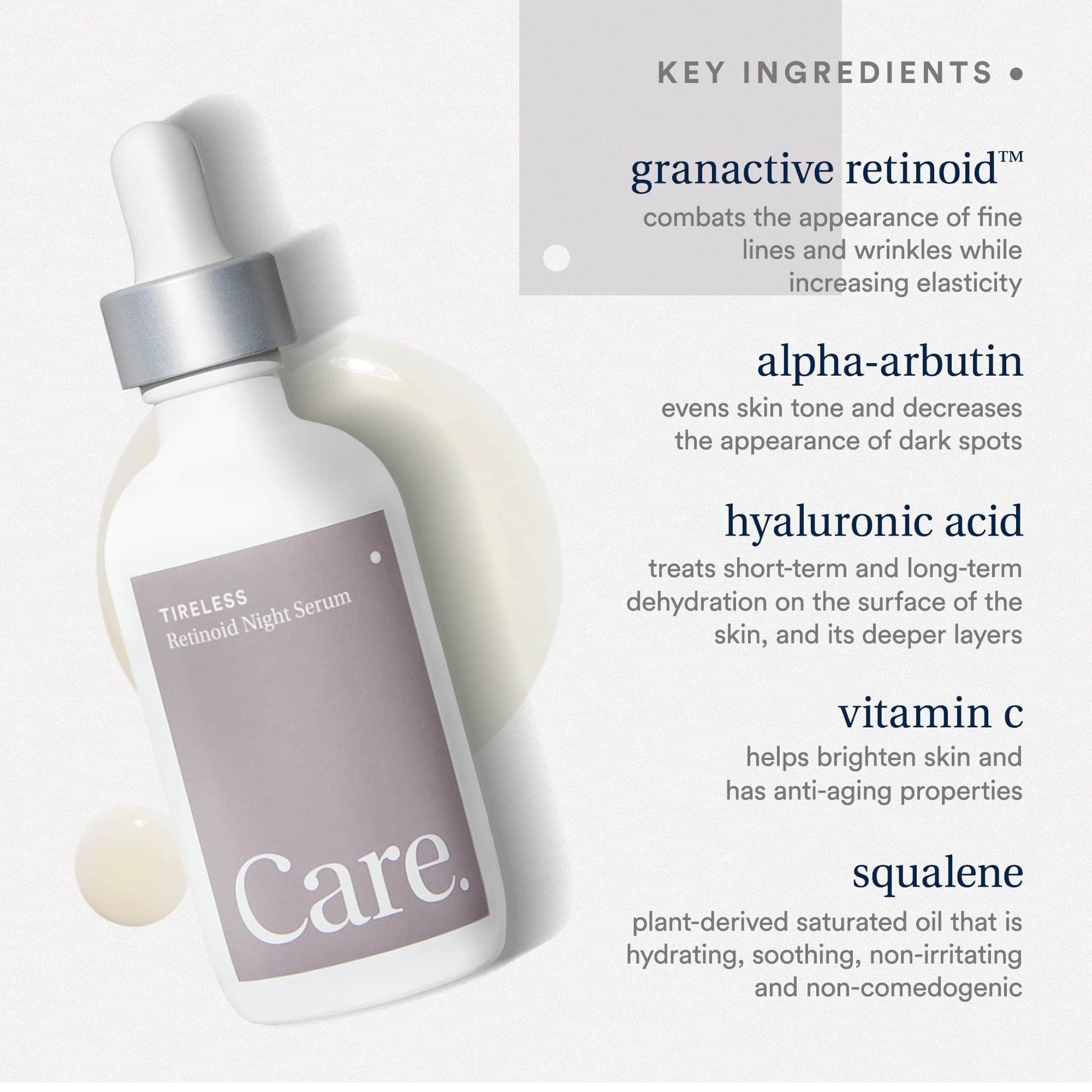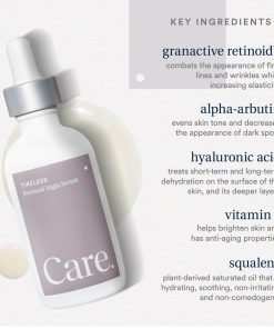 Suero nocturno transformador – Logra una piel húmeda y radiante con este suero de retinol con ácido hialurónico y glicerina. Ideal para uso nocturno, nuestro exclusivo suero de retinol para el rostro fortalece la barrera de humedad natural de tu piel para una hidratación intensa. Revela tu piel juvenil y radiante – A diferencia de los productos de retinol tradicionales que causan irritación, esta mezcla vegana aprovecha las propiedades impulsoras de colágeno del retinoide granactivo para la renovación celular. También ayuda a reducir la apariencia de líneas finas y manchas de la edad. Unifica el tono de la piel – Infundido con alfa-arbutina, nuestro suero facial de retinol mejora visiblemente las manchas oscuras y el tono desigual de la piel. Un suero nutritivo para las rutinas de cuidado nocturno, esta fórmula ofrece beneficios notables que se multiplican con el uso constante. Protege y realza la luminosidad – Aplicar este suero de retinol regularmente protege tu piel del estrés ambiental, gracias a potentes antioxidantes de la vitamina C y la cafeína. Fabricado solo con productos buenos – El Suero de Retinoide Incansable de Care Skincare no contiene parabenos, ftalatos, aceites minerales, gluten, fragancias artificiales y productos químicos perjudiciales. Es una mezcla libre de crueldad y alcohol que tu piel seguramente amará!