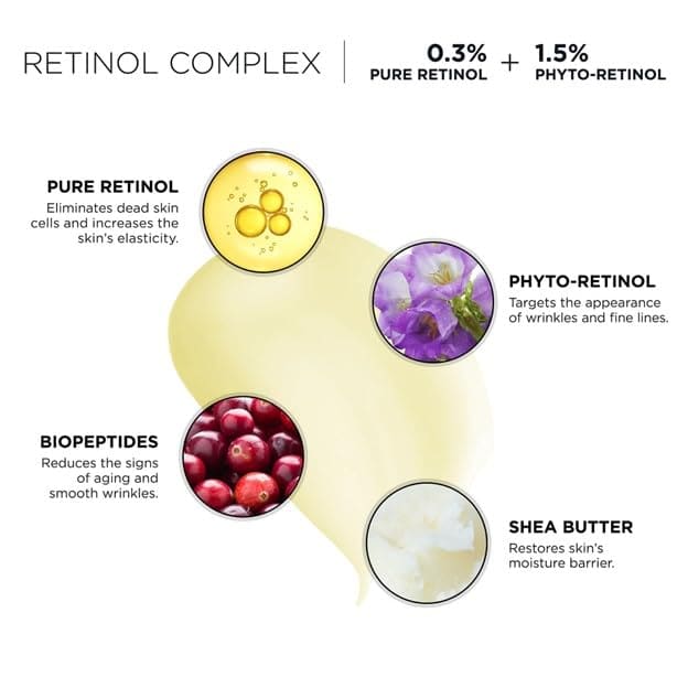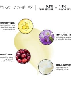 Nuestra crema antiarrugas para la cara y el cuello está infundida con una mezcla de ingredientes activos, incluyendo manteca de karité, bio péptidos, 1.5% fito-retinol y 0.3% retinol puro. La manteca de karité proporciona propiedades calmantes, mientras que los bio péptidos mejoran la elasticidad y firmeza de la piel. El retinol encapsulado funciona con un sistema de liberación controlada para una acción enfocada láser.