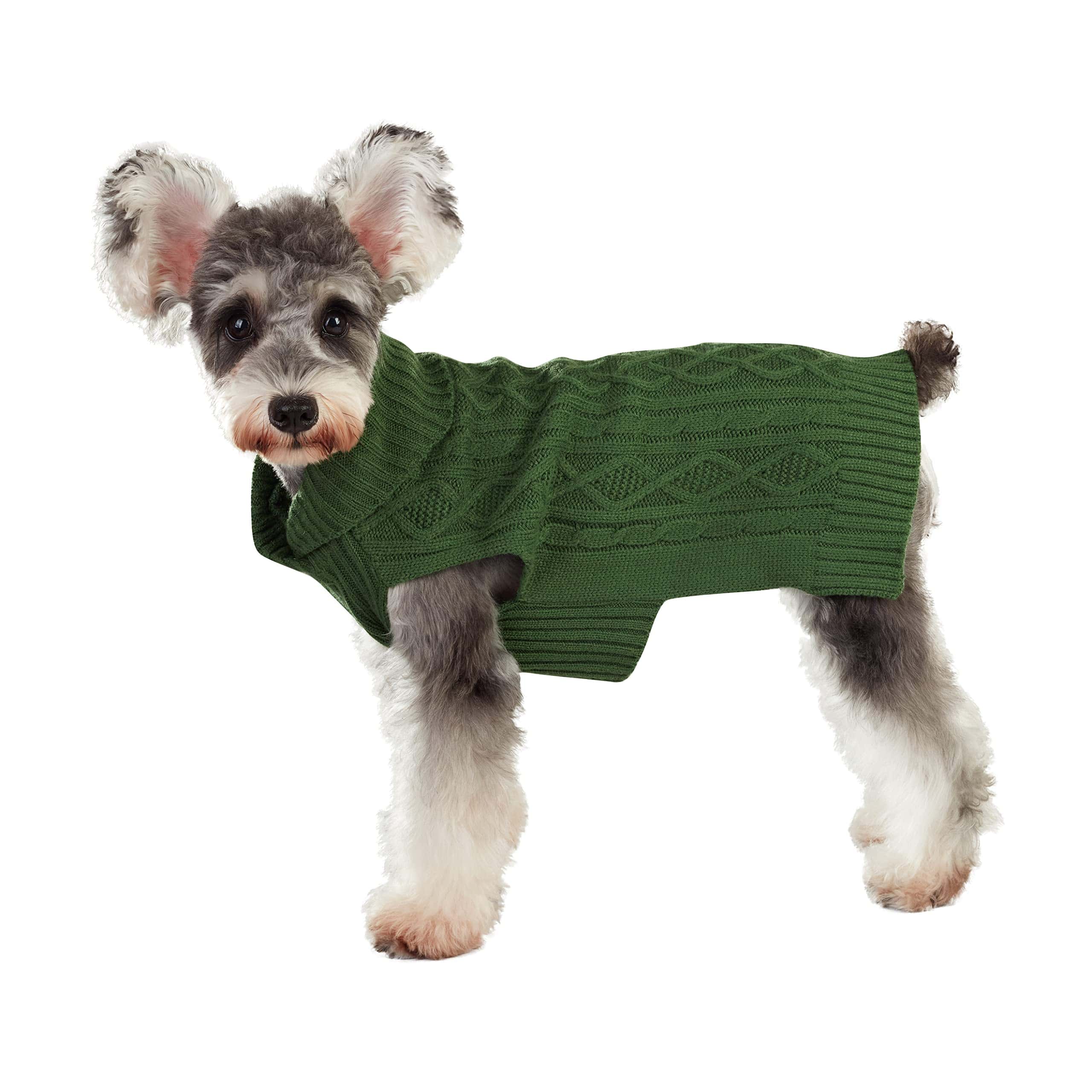 1. Suéter de Cuello Alto: Este adorable suéter para perros es perfecto para sesiones de fotos en familia; presenta un diseño y textura tejidos con recortes para las patas y la parte inferior del cuerpo.