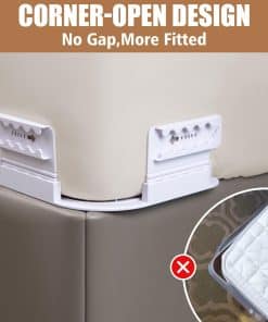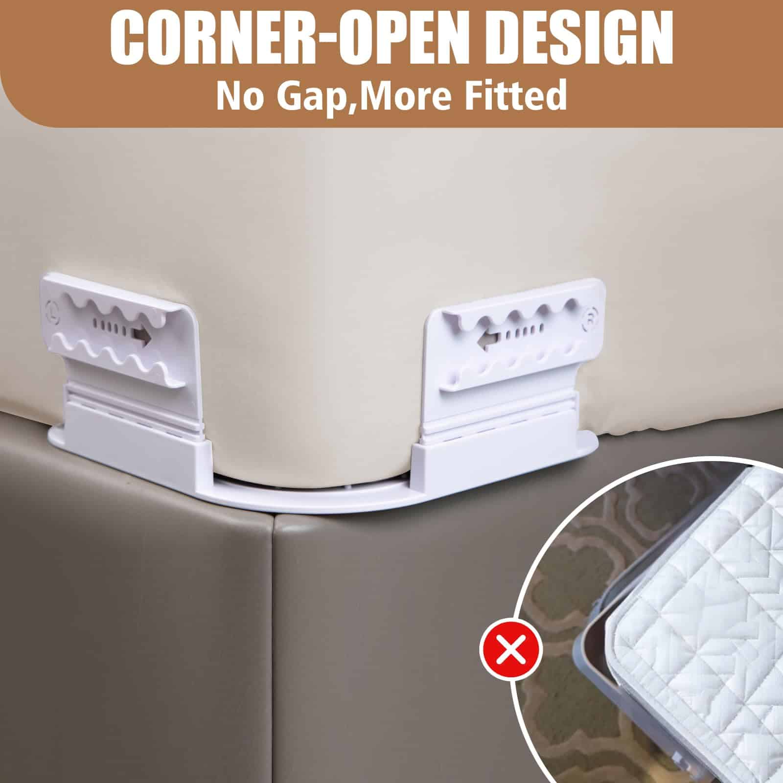 3. Esquinas sin brechas – ¡Sin huecos, sin deslizamiento! Nuestro diseño de borde flexible se adapta automáticamente a las esquinas redondas, cuadradas o irregulares del colchón para un sellado de borde de 360 grados. ¡Nuestros sujetadores de sábanas son como una prensa!