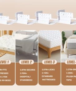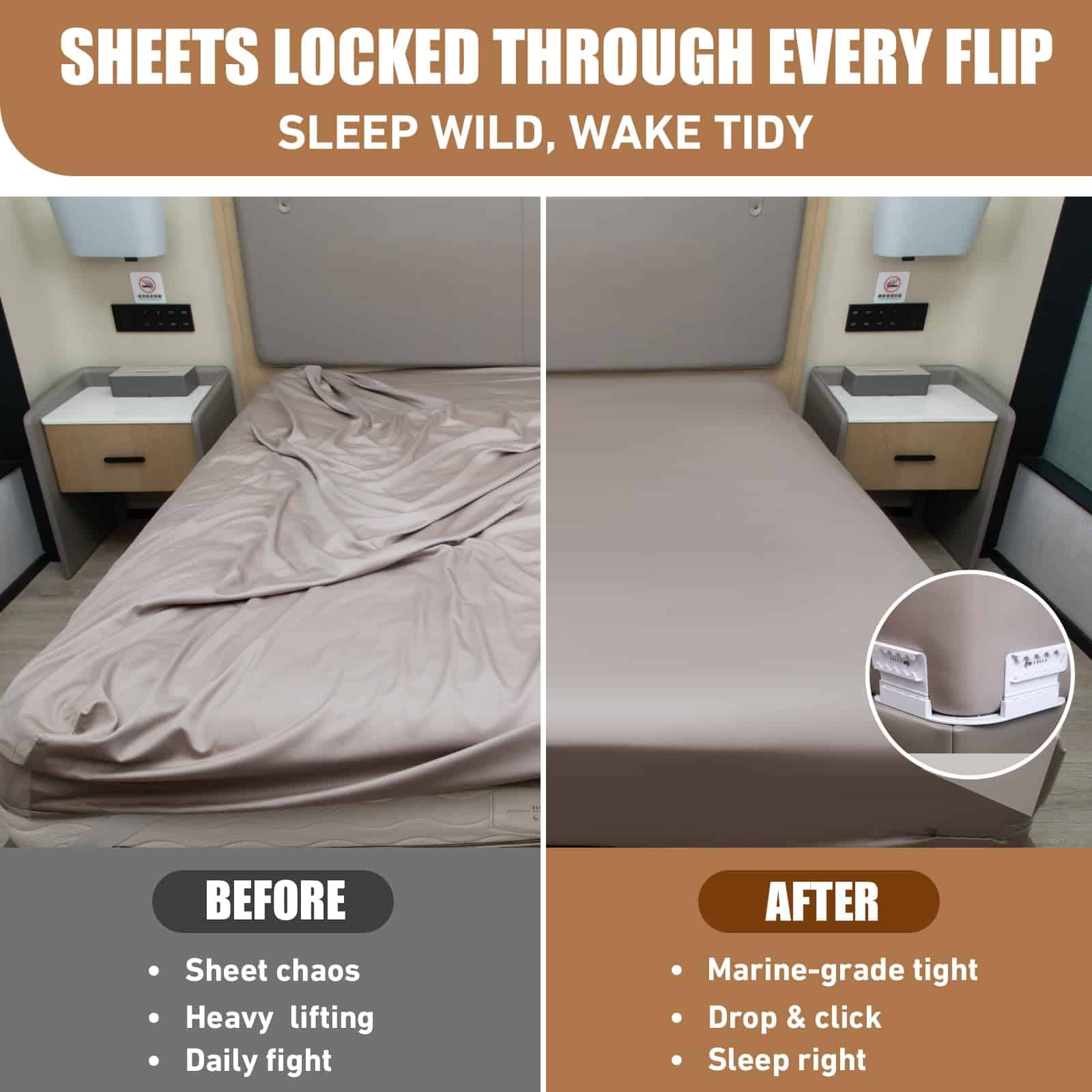 1. Sistema de bloqueo pendiente de patente – ¡Aguante imbatible! Olvídate de clips o correas endebles que enganchan las sábanas. Nuestros exclusivos sujetadores de sábanas utilizan correas elásticas de fuerza industrial y agarres envolventes de 360 grados para bloquear las sábanas firmemente sin dañar el tejido. Perfecto para los que se mueven mucho durante el sueño, camas ajustables o colchones pesados ¡Sin deslizamiento garantizado!