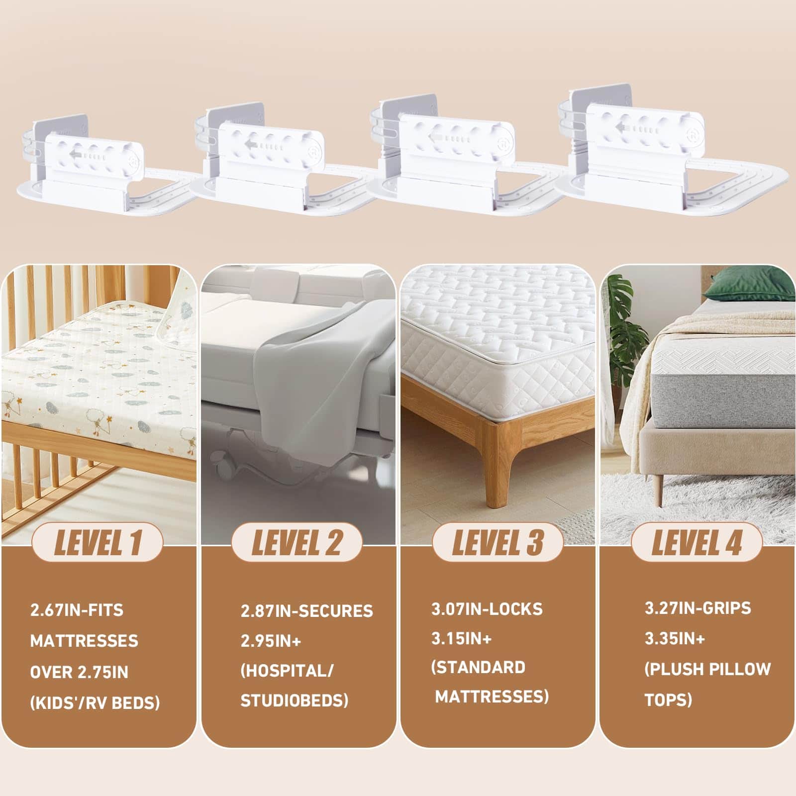 2. Ajuste universal para todos los colchones con altura ajustable – ¡Deja atrás los agarres de altura fija que fallan! Nuestros sujetadores de sábanas mejorados funcionan perfectamente con CUALQUIER cama (2.7 pulgadas o más) camas para niños, camas de perfil bajo, colchones de hospital/RV, camas estándar o colchones mullidos. ¡Una herramienta que sirve para todo! ¡Deja atrás los agarres desparejados para distintas camas!