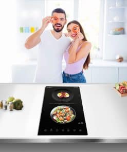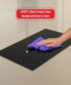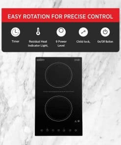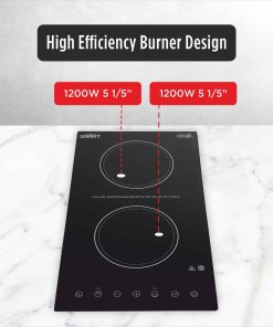Summit Appliance CR2B15T1B 12″ Ancho 115V 2 Quemadores Radiantes de Vidrio Cerámico Negro Schott con Controles de Pantalla Táctil Digital, 9 Niveles de Potencia, Diseñado para Instalación Empotrada El CR2B15T1B es una placa de cocina radiante de 115V de 12″ de ancho diseñada para adaptarse a recortes de encimera populares de 10 3/4″ de ancho por 19 7/8″ de profundidad. Dos quemadores de 5 1/2″ cuentan con una operación de 1200W cada uno para cubrir la mayoría de las necesidades de cocción. Los controles de pantalla táctil digital están ubicados en la parte delantera para una mayor accesibilidad, evitando que los usuarios alcancen sobre quemadores calientes para hacer ajustes. Nueve niveles de potencia ofrecen una verdadera versatilidad culinaria, con una pantalla digital que facilita la lectura y el manejo de los ajustes con solo tocar un botón. Esta unidad también incluye una función de temporizador que le permite programar un nivel de potencia y tiempo de cocción (hasta 99 minutos). Características Clave – Placa de cocina eléctrica de dos quemadores de 2400W con operación de 115V – Controles de pantalla táctil intuitivos para una cocina más inteligente – Superficie de vidrio cerámico liso fabricada con vidrio Schott negro intenso ofrece un aspecto moderno y fácil de limpiar – Función de temporizador incluida para un calentamiento más fácil – Incluye una función de bloqueo para niños, apagado automático e indicadores de calor residual Especificaciones – Altura del Gabinete: 2″ – Ancho: 11.38″ – Profundidad: 20.5″ – Gabinete: Negro – Seguridad Eléctrica Estadounidense: ETL – Seguridad Eléctrica Canadiense: ETL-LC – Amperios: 20 – Voltaje/Frecuencia: 115V AC/60Hz – Tipo de Calefacción: Radiante – Superficie: Vidrio – Tipo de Elemento: Superficie de Vidrio – Número de Elementos: 2 – Controles: Digitales – Recorte de Encimera: 5.9″x10.75″x19.9″ – Fuente de Alimentación: 115V – Tamaño del Elemento 1: 5.5″ – Potencia del Elemento 1: 1200 – Tamaño del Elemento 2: 5.5″ – Potencia del Elemento 2: 1200 – Peso: 10 libras – Peso de Envío: 12 libras