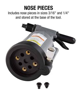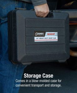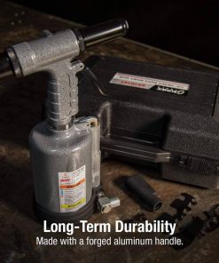 Esta pistola de remaches de alta resistencia de Sunex de 1/4 de pulgada coloca todos los remaches ciegos convencionales, estructurales y mono-bulbos de hasta 1/4 de pulgada de diámetro en todos los materiales. Cuenta con una potencia de tracción de 3,960 lbF @ 90PSI y mango de aluminio forjado. Incluye estuche de almacenamiento moldeado por soplado. Especificaciones: presión de aire (psi) 70-100, longitud de carrera (pulgadas) 3/4, altura (pulgadas) 12-3/8, peso (libras) 5.57, tamaño mínimo de la manguera (i.d.) 3/8, tamaño de entrada de aire (npt) 1/4.