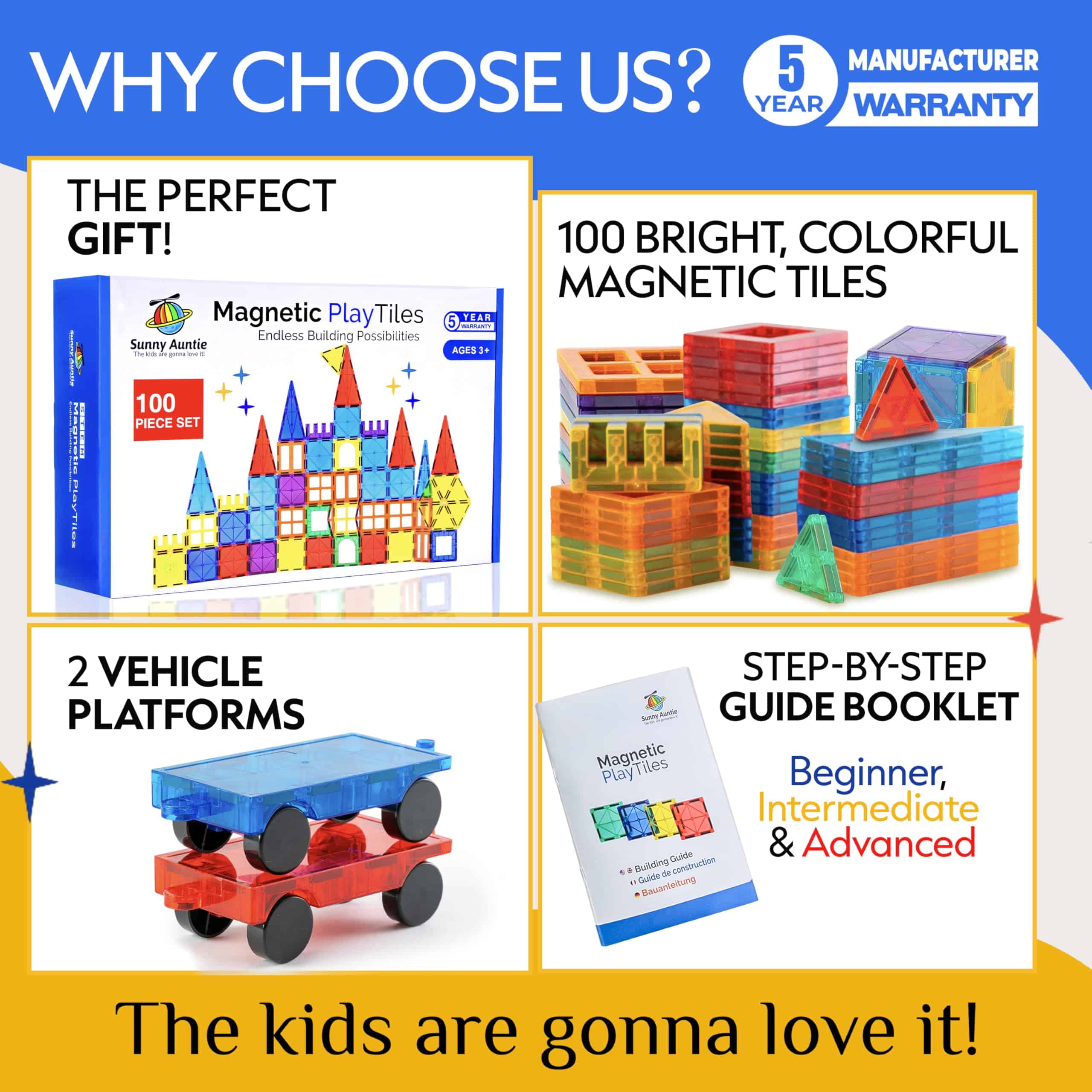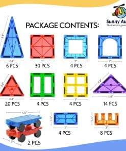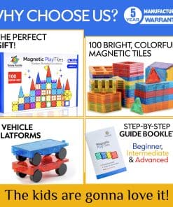 El conjunto definitivo para principiantes! Este set es perfecto para niños que nunca han probado baldosas/bloques magnéticos pero disfrutarán mucho de ellos una vez que empiecen. El set contiene 100 baldosas magnéticas en varias formas y 2 coches, la combinación perfecta para construir los modelos más populares y mucho más. ¡Ocupará a tus hijos durante horas y les traerá mucha alegría! Las Baldosas Magnéticas vienen con una garantía completa de 5 años!