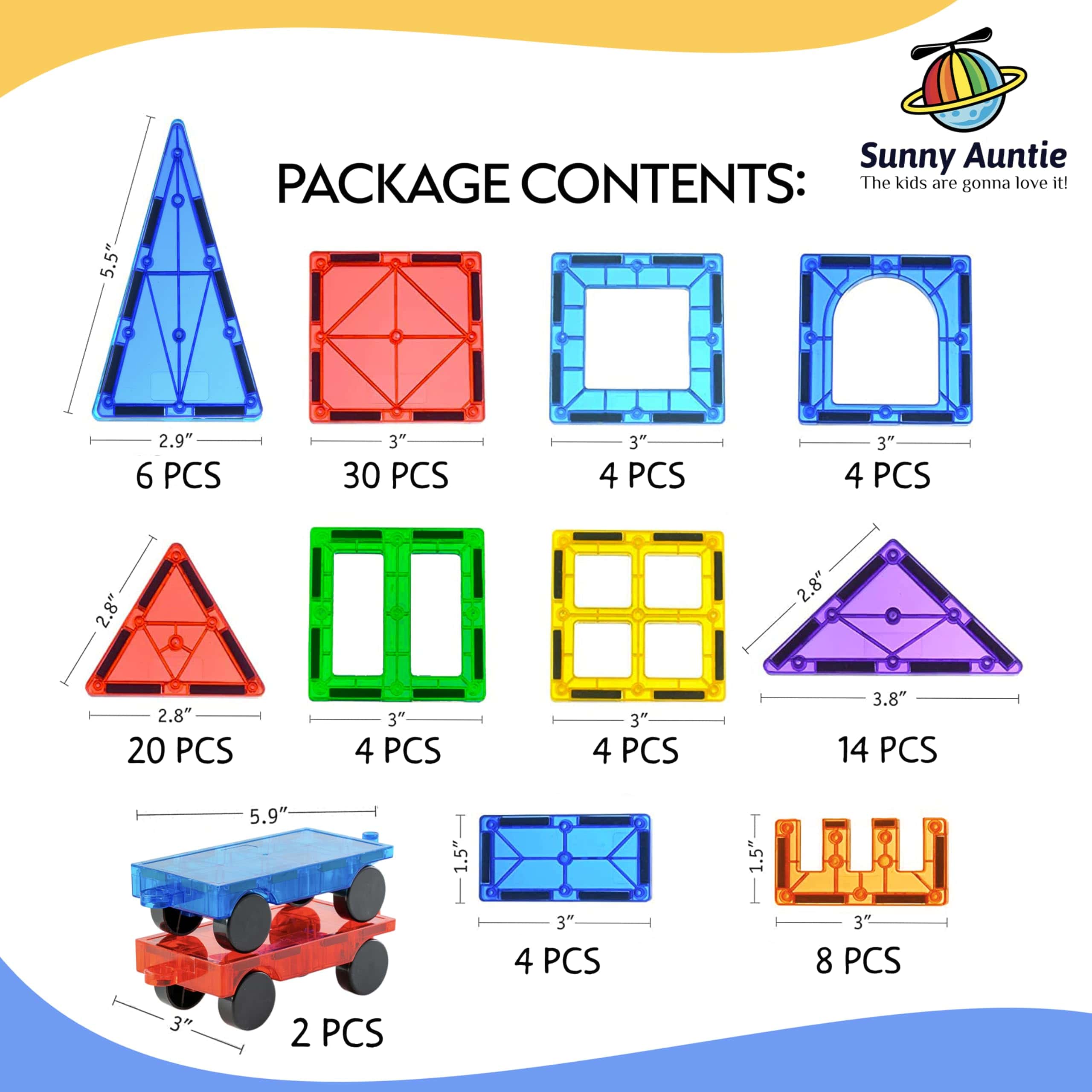 Baldosas Magnéticas 100 piezas. Baldosas Magnéticas SUNNY AUNTIE es un juguete excepcional para promover el desarrollo infantil. Ayuda a los niños a construir y fortalecer sus habilidades de reconocimiento de colores y formas, pensamiento creativo, resolución de problemas creativos, uso de la imaginación, y mucho más, ¡todo mientras se divierten! Es un excelente juguete para fortalecer el vínculo entre padres e hijos, jugar con otros niños o jugar de forma independiente. ¡Un gran regalo para cumpleaños, vacaciones o cualquier ocasión! Las Baldosas Magnéticas son el regalo perfecto que cualquier niño amará durante años. Son brillantes, coloridas y gratificantes de crear. ¡Observa cómo la autoestima de tu hijo se dispara cuando logre construir una casa, castillo, cohete u otros modelos del folleto, así como diseños provenientes de sus propias mentes creativas. ¡Las posibilidades son infinitas! Gran regalo/juguete para niños y niñas de 3 años en adelante. Apto para edades de 3 a 8. ¡Juega de forma segura! Nuestras Baldosas Magnéticas están hechas de plástico ABS de alta calidad, no tóxico y libre de BPA. Los bordes de las baldosas son redondeados y seguros para que los niños las manipulen. El tamaño de las baldosas es adecuado para manos pequeñas y los niños pueden manejarlas fácilmente. Nuestro producto ha pasado un test de laboratorio estándar ASTM y se ha encontrado adecuado para niños y niños pequeños. ¡Un juguete que tanto los niños como los padres amarán! El set incluye 100 baldosas magnéticas, 2 coches, un folleto de guía especialmente diseñado y una bolsa de almacenamiento de tela de alta calidad. Las baldosas están bien hechas, son duraderas y resistentes, y tienen imanes fuertes. Las Baldosas Magnéticas son un buen juguete para mantener a los niños entretenidos dentro y fuera de la casa e incluso en viajes por carretera y vacaciones. ¡Es un juguete que tanto los niños como los padres amarán ya que incorpora mucha creatividad e imaginación!