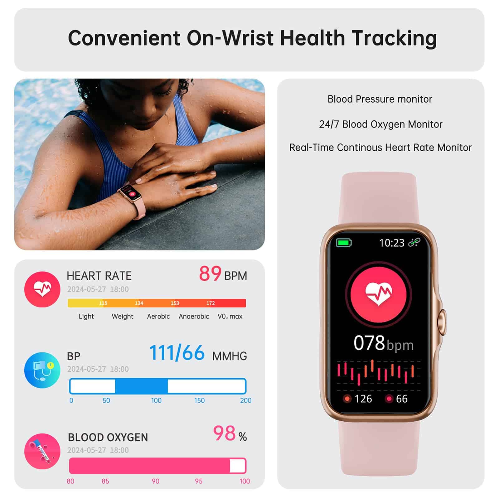 1. Diseñado para una experiencia de uso más cómoda. Hecho de materiales avanzados y ligeros, la pulsera de fitness es más ligera que otras. Combina moda y durabilidad, convirtiéndola en un accesorio de moda para cualquier ocasión.