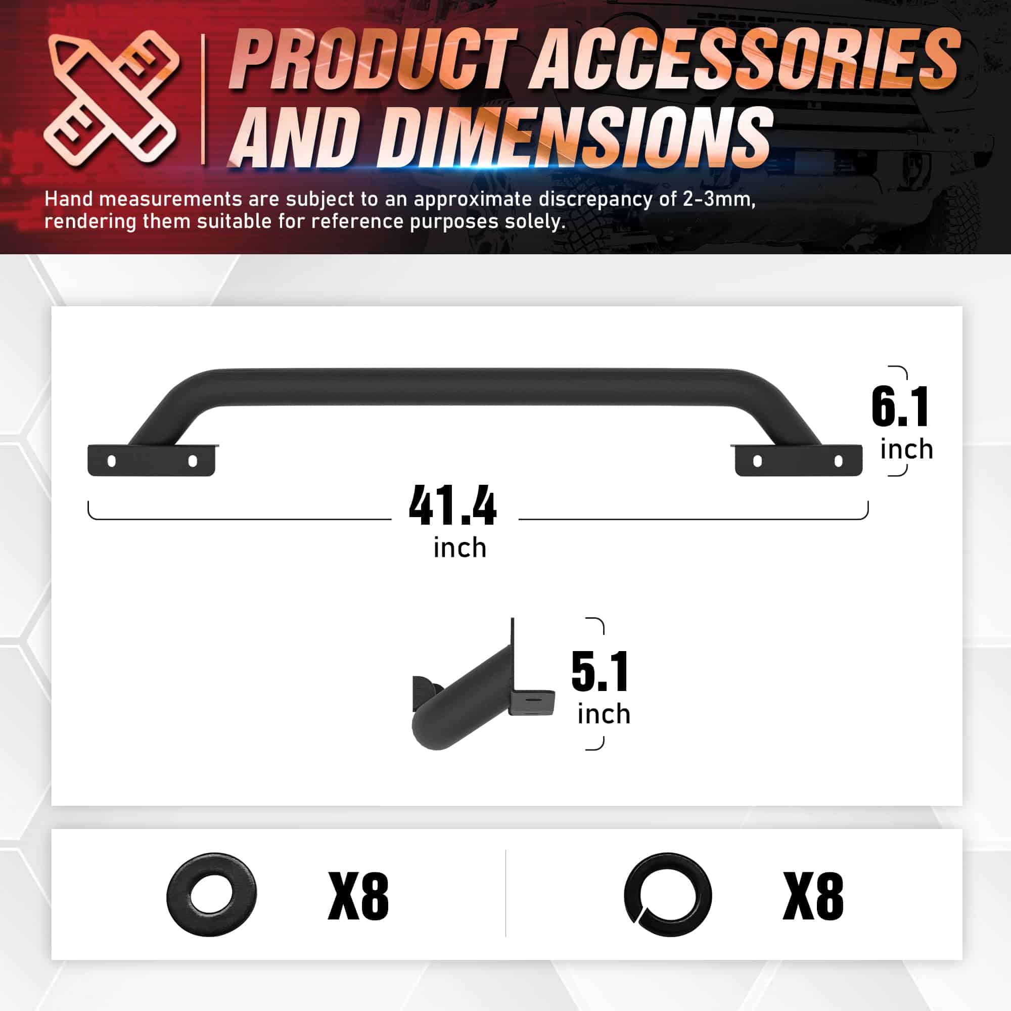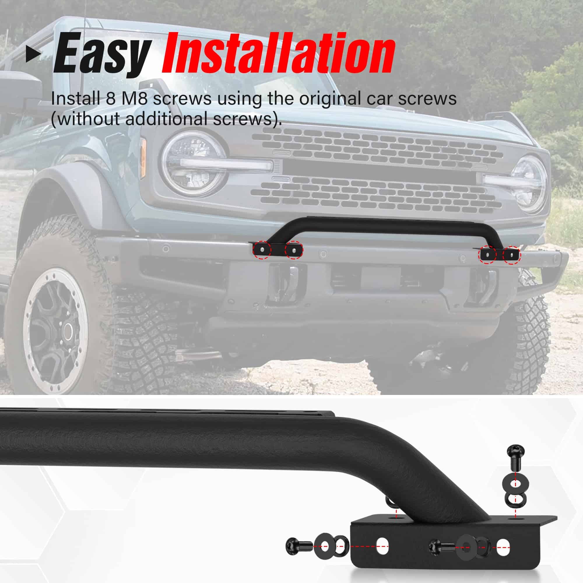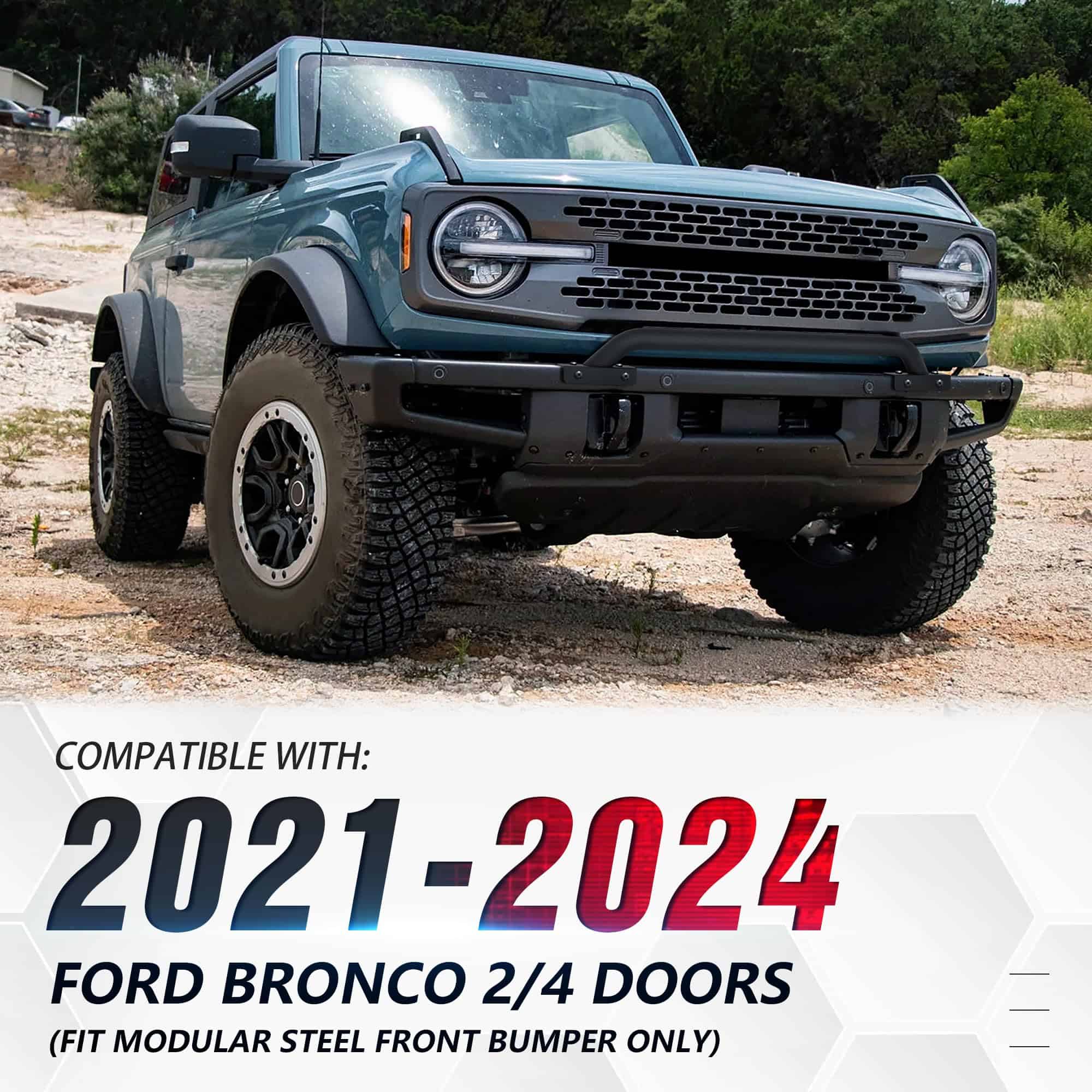 1. A medida para propietarios de Ford Este Bull Bar es exclusivamente compatible con los modelos Ford Bronco 2 puertas y 4 puertas 2021-2024 equipados con parachoques delantero modular de acero original. Tenga en cuenta que no es compatible con el Ford Bronco Sport.