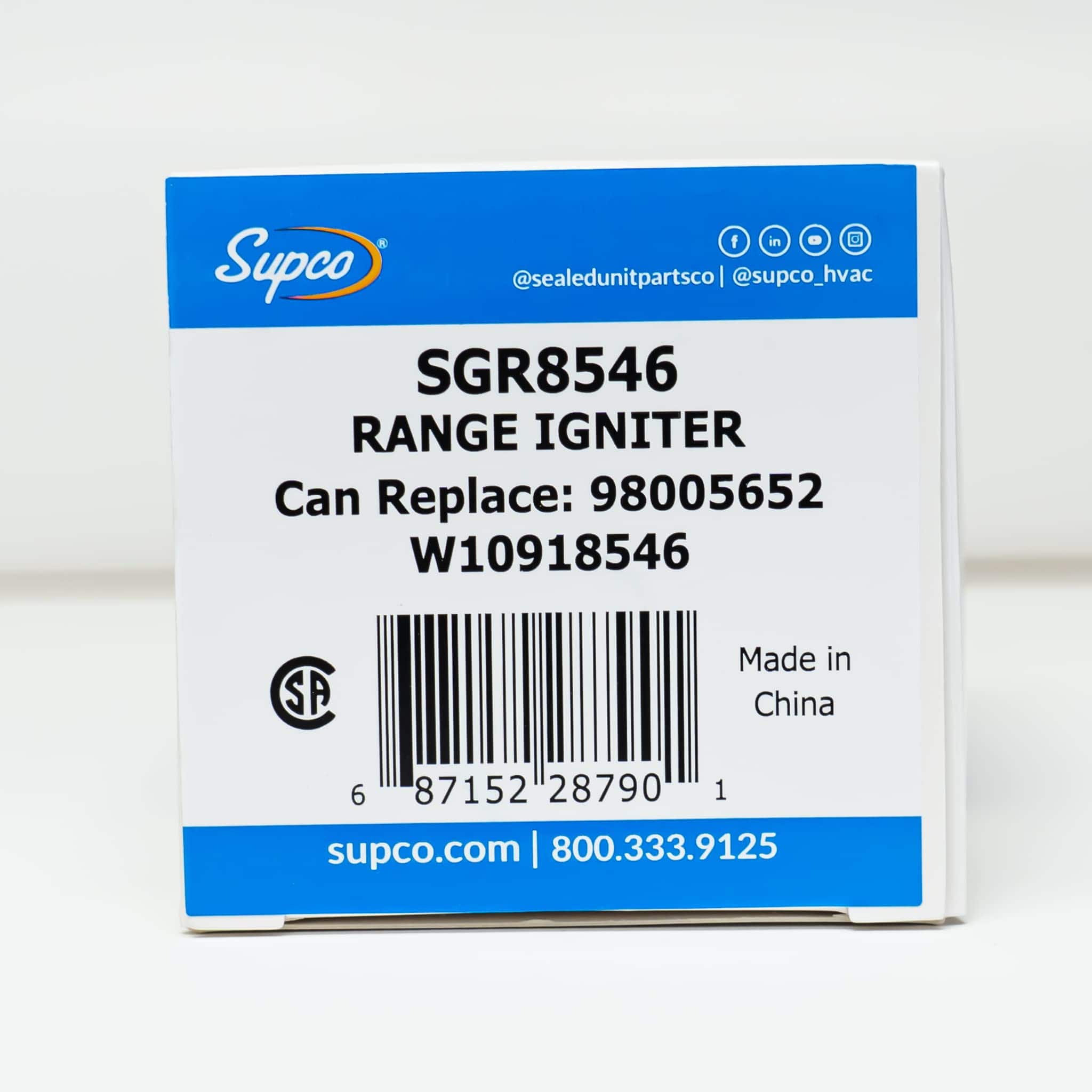 Supco número de parte SGR8546 Igniter de Horno de Rango Glow Bar 1.5 x 1.25 x .75 pulgadas Cerámica Blanca Reemplaza 98005652, W10918546, WP98005652, W10140611, WPW10140611, IG5652, W10918546CM, DS044KX, AP6037202 y PS11770066 Diseñado para adaptarse a modelos específicos de Whirlpool, Roper, Amana y Estate