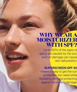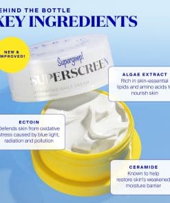 ¡Supergoop! Superscreen es una crema hidratante diaria y protector solar SPF 40 en uno que protege tu piel de los dañinos rayos UVA, rayos UVB e incluso de la contaminación ambiental y la luz azul. Su textura ligera se absorbe fácilmente en la piel, dejándola suave, suave e hidratada. Formulada con una combinación de humectantes, antioxidantes y activos reparadores de la piel recolectados de algas azul-verdes, esta crema ayuda a restaurar y mejorar la apariencia de la piel. Libre de oxibenzona y octinoxato, Superscreen es adecuado para todo tipo de piel y tono, ofreciendo una hidratación intensa y una protección solar confiable. Aplica generosamente como último paso en tu rutina de cuidado de la piel y 15 minutos antes de la exposición al sol para lograr los mejores resultados. ¡Protege tu piel y mantén su salud con Supergoop! Superscreen!