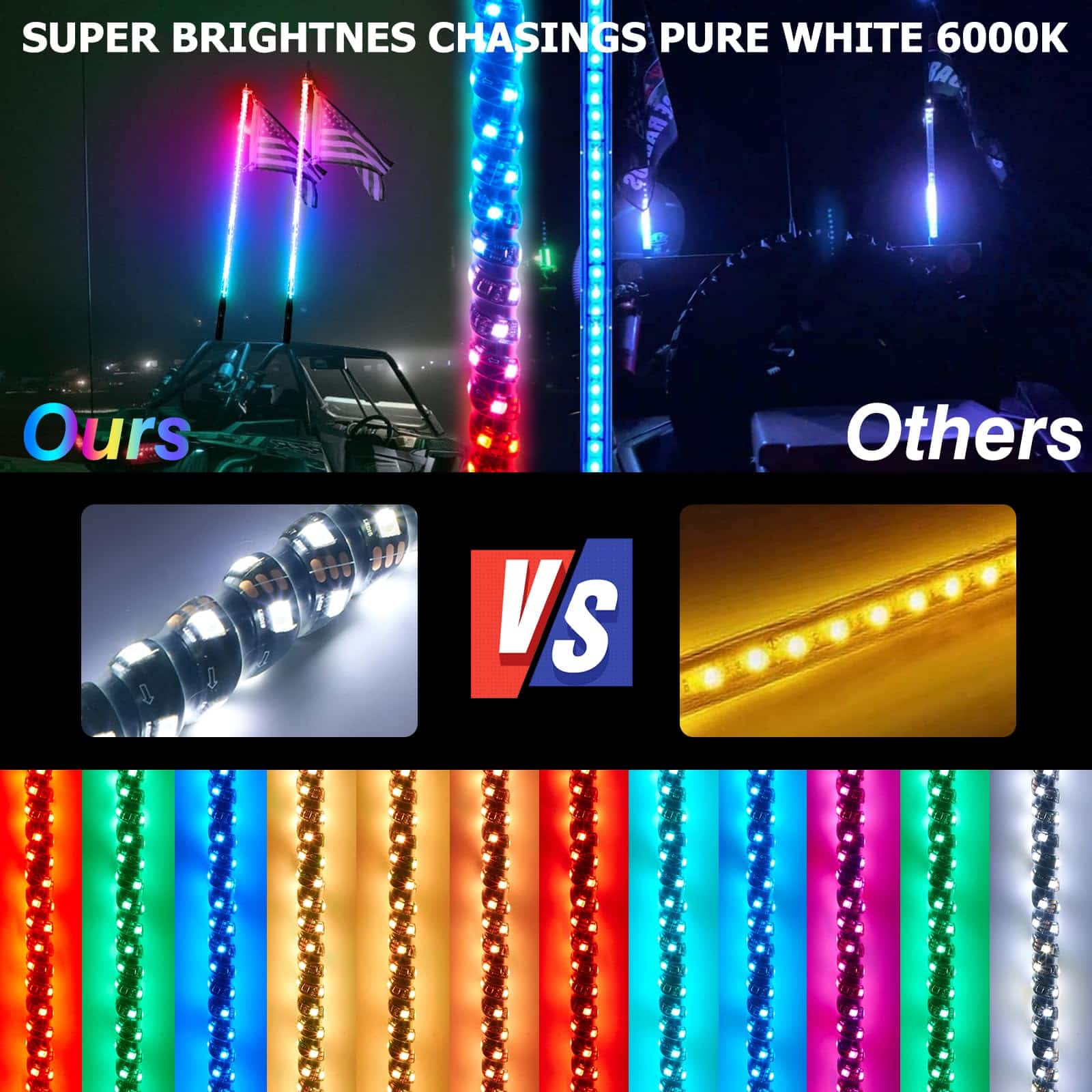 1. CARACTERÍSTICA DE ALTA RESISTENCIA: Los faros en espiral de 2 pies con 138 luces LED con funciones de señal de giro R y L / freno / marcha atrás son impresionantes luces blancas puro verdadero 6000k + colores de persecución, iluminando la noche con potentes cuentas de luz, 360 resplandor en espiral y más de 300 patrones de persecución, Construido para durar meticulosamente a prueba de golpes, impermeable y tubo envuelto flexible de 360 grados. Esta luz en espiral le da a su automóvil un aspecto genial y llama fácilmente la atención de los demás.