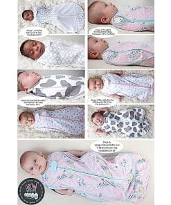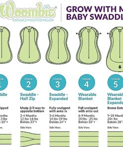 La Woombie Grow With Me es un swaddle de 5 etapas y manta para bebé que cubre a tu bebé en crecimiento de 0-9 meses con una longitud extendida BONUS para alcanzar hasta 18 meses, cubriendo todas las etapas de un sueño saludable y exitoso para tu bebé! Etapa Uno: Swaddle — (0-3 Meses/5-13 lbs). Para bebés de más de 20 pulgadas de largo. Coloca al bebé dentro del swaddle y simplemente cierra el cierre desde abajo hasta arriba. Etapa Dos: Swaddle — (2-4 Meses/12-16 lbs). Para bebés de más de 22 pulgadas de largo. Abre el swaddle 2/3 del camino hasta la esquina opuesta inferior. Se expande 1.25″ y agrega 4″ de longitud. Etapa Tres: Swaddle Expandido — (3-6 Meses/14-19 lbs). Para bebés de más de 24 pulgadas de largo. Abre completamente el swaddle con los brazos del bebé permaneciendo adentro para el mismo toque reconfortante. El swaddle aumenta más de 3″ de ancho y 4-8″ de longitud. Etapa Cuatro: Manta para Dormir — (6-9 Meses/20-25 lbs). Para bebés de más de 24 pulgadas de largo. Con el swaddle completamente abierto, abre los cierres de los brazos en los lados para permitir un sueño «sin brazos», transformando el swaddle en una cálida y acogedora manta para dormir. BONO Etapa Cinco: Manta para Dormir XL — (9-18 Meses/20-28 lbs). Para bebés de 27-33 pulgadas de largo. La tela en la parte inferior del swaddle se alarga para crecer con tu bebé!