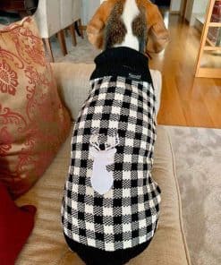 1. SWEATER DE CUELLO ALTO CLÁSICO: Mantén a tu peludo calentito durante su paseo con nuestro clásico sweater de cuadros negros y blancos con estilo de cuello alto. El color audaz y el detallado de reno en la espalda harán que tu mascota destaque. Perfecto para la navidad.