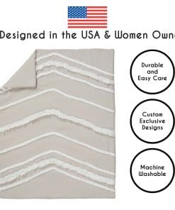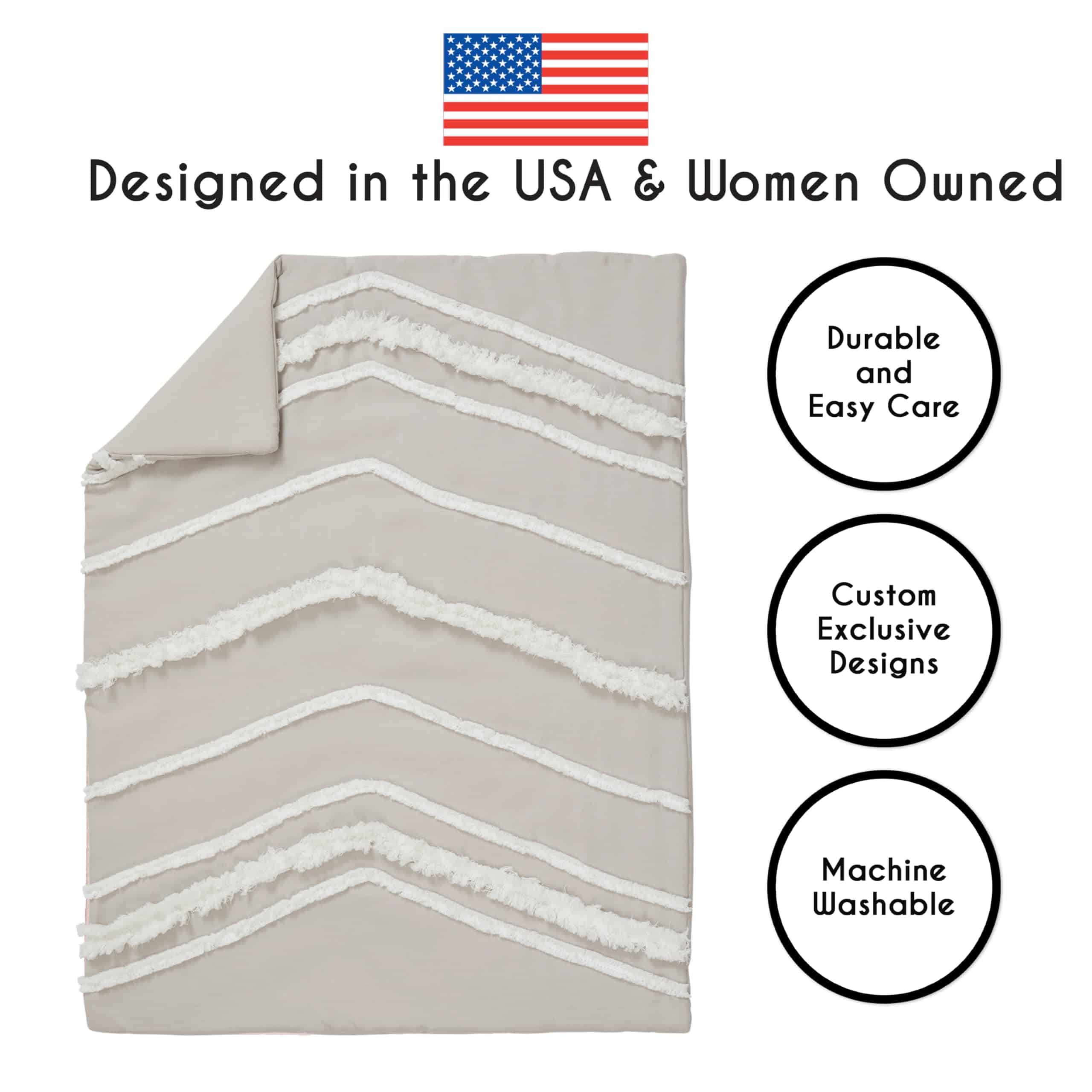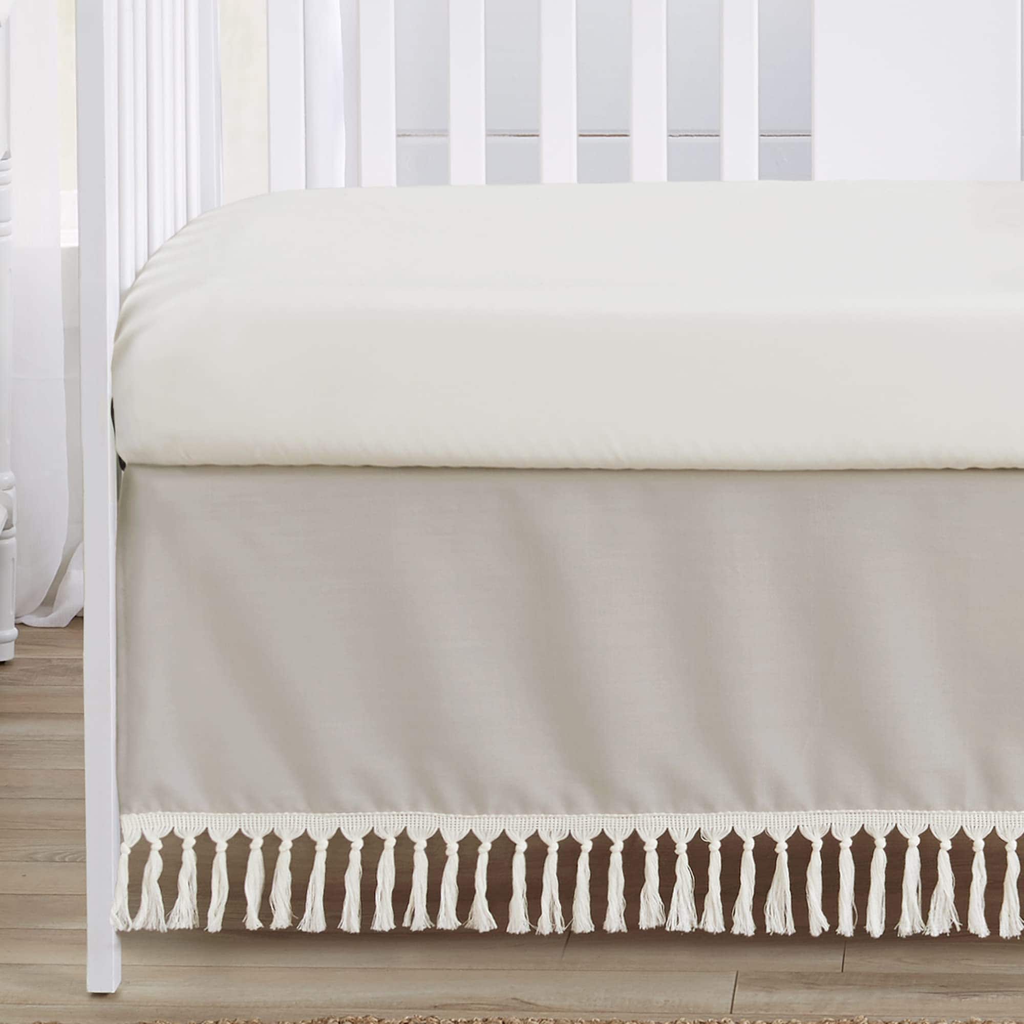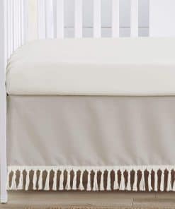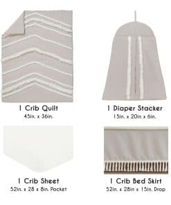 Este conjunto de ropa de cuna neutral para bebé cuenta con una manta de cuna de lino con un moderno borde de macramé en un diseño de flecha de chevron contemporáneo que se invierte a taupe. La falda beige sólida presenta un borde de flecos de macramé anudado bohemio a lo largo de la parte inferior. La sábana de cuna de algodón 100% crema transpirable tiene elástico cosido alrededor del borde inferior para un ajuste seguro en la mayoría de las cunas estándar. El organizador de pañales a juego mantiene los pañales convenientemente organizados. Lavable a máquina. Secar a baja temperatura. Diseñado en EE. UU. para ser seguro y duradero: Como orgulloso miembro de JPMA que prueba rigurosamente los productos para cumplir o superar las normas de seguridad de CPSC, Sweet Jojo Designs se dedica a crear productos de alta calidad que combinan estilo, comodidad y funcionalidad. Nuestros productos están diseñados con materiales y detalles premium para apoyar el sueño y el bienestar de su bebé y ayudar a los padres a diseñar el espacio perfecto para su pequeño. Confiable en todo el mundo, Sweet Jojo Designs da vida a la visión de su guardería. Regalo perfecto: ¡Agregue ropa de cama de cuna neutra a su lista de imprescindibles! Incluir un conjunto de ropa de cama para bebé en su registro de regalos, en una canasta de regalo para un baby shower o como un regalo de revelación de género es una forma fácil de prepararse para la llegada de un bebé. Un edredón brinda decoración única o una manta de abrazos y sábanas ajustables para cuna proporcionan una superficie suave para dormir. Las faldas de polvo de cuna agregan un toque pulido y pueden ocultar el almacenamiento bajo la cuna. Y un organizador de pañales mantiene los pañales organizados y accesibles. Diseño de guardería facilitado: Si tiene una habitación para decorar, tenemos infinitas opciones de coordinación para ayudarlo. Un tema de guardería puede planificarse en torno al conjunto de ropa de cama para bebé, lo que crea una habitación elegante y cohesiva sin tener que mezclar y combinar piezas. Sweet Jojo Designs hace que decorar sea simple con sábanas para cunas a juego, conjuntos de ropa para niños pequeños, juegos de sábanas para cunas, fundas para cambiador, mantas de hitos, decoraciones de pared, accesorios decorativos, tratamientos para ventanas y más para completar el aspecto de su habitación de bebé.