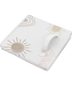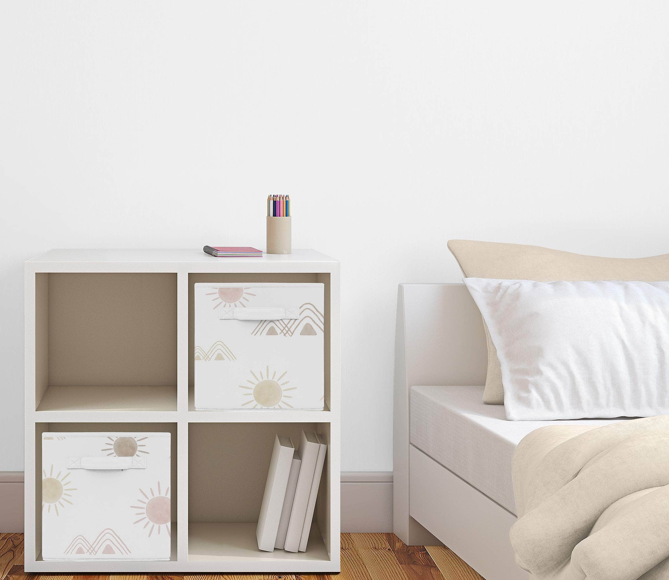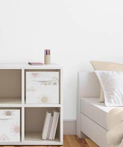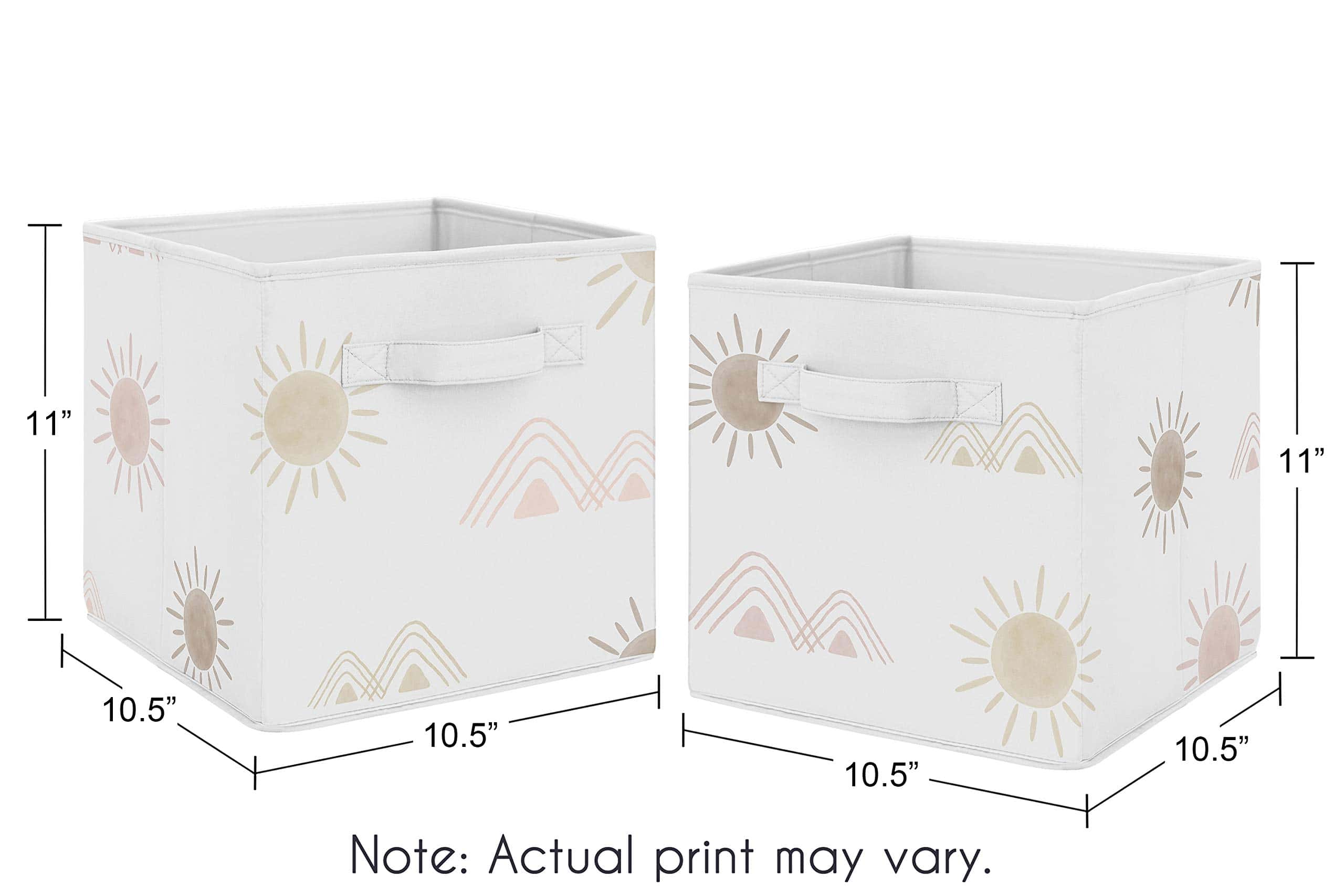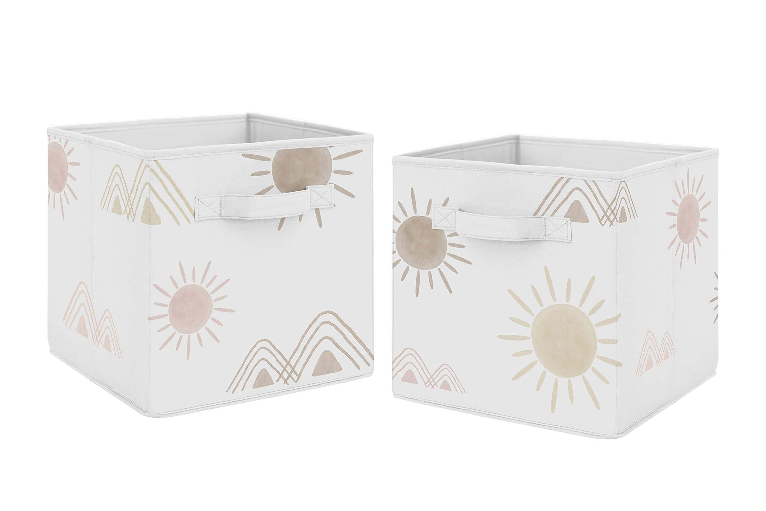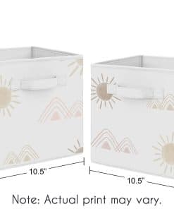 Conjunto de 2 cubos de almacenamiento de tela plegables perfectos para organizar los juguetes de los niños. Cada cubo mide 11 pulgadas de ancho por 10.5 pulgadas de largo y 10.5 pulgadas de alto. Presenta un alegre estampado de sol del desierto y montañas en tonos de rosa y topo. Estos cubos son fáciles de limpiar con un paño húmedo. Las asas de tela reforzadas hacen que sea fácil deslizar los cubos dentro y fuera de la mayoría de los estantes estándar. ¡Complementa tu decoración temática bohemia con estos cubos de almacenamiento a juego de Sweet Jojo Designs!