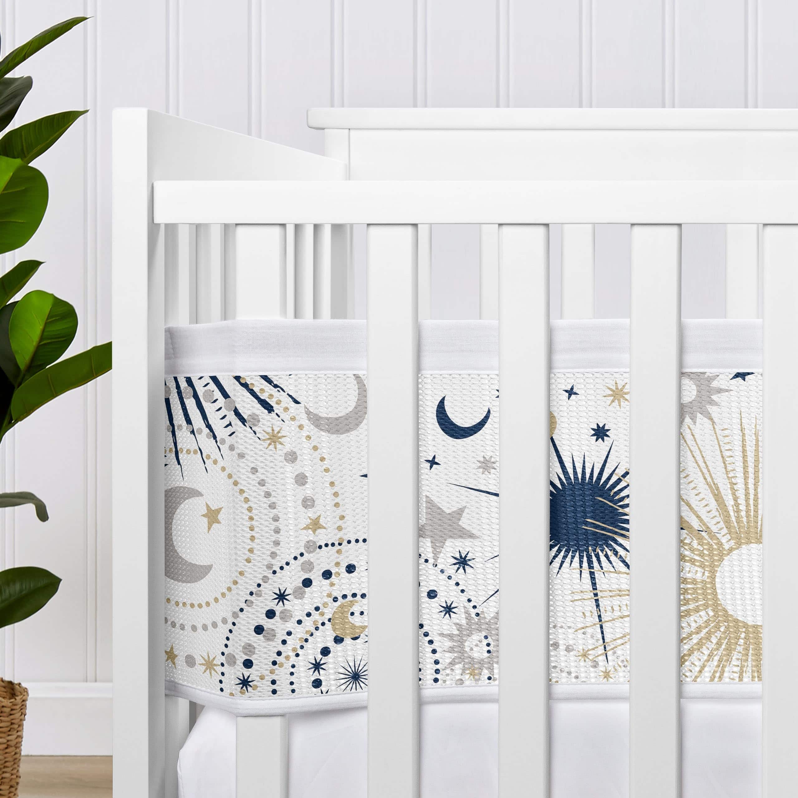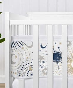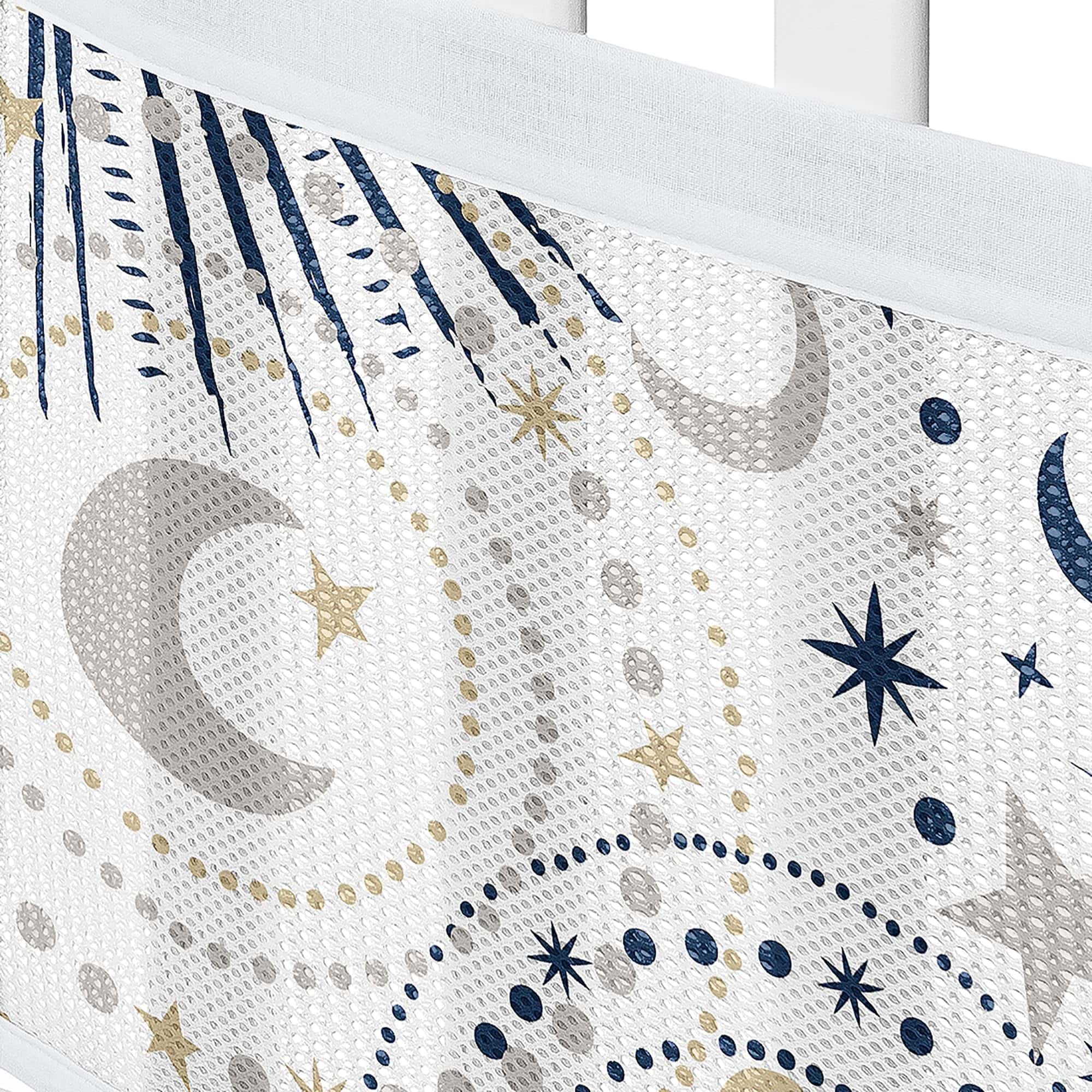 El Protector de Cuna de Malla Sweet Jojo Designs + BreathableBaby incluye un panel largo y un panel corto de malla diseñados específicamente para cunas estándar en América del Norte. Hecho de malla de poliéster Classic de una sola capa con tecnología de canales de aire A.C.T. de 3 mm de grosor, este protector de cuna se caracteriza por su estampado temático de estrellas y lunas metálicas en una paleta de colores de azul marino, oro, plata y gris. Además de combinar perfectamente con la ropa de cama Celestial de Sweet Jojo Designs, los protectores de cuna de malla proporcionan una solución ideal para mantener los brazos y piernas de su bebé seguros dentro de la cuna sin restringir el flujo de aire. También actúan como un escudo visual para ayudar a proporcionar un sueño más tranquilo. No coloque otros objetos suaves en la cuna junto con el bebé. Posicione los lazos fuera de la cuna y asegúrelos firmemente para evitar enredos.