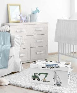 Sweet Jojo Designs ofrece esta Caja de Almacenamiento de Tela para Juguetes con un estampado de camiones de construcción en colores azul, verde, amarillo, gris y negro. Con unas dimensiones de 21 pulgadas de largo, 11 pulgadas de ancho y 10.5 pulgadas de alto, esta caja es perfecta para la habitación de un bebé o un niño. La limpieza es fácil, ya que solo se necesita un paño para limpiarla. Además, cuenta con asas reforzadas integradas que facilitan su transporte, junto con una tapa resistente y reforzada. ¡Complementa esta caja de almacenamiento con otros accesorios de decoración y ropa de cama en el mismo tema exclusivo de Sweet Jojo Designs!