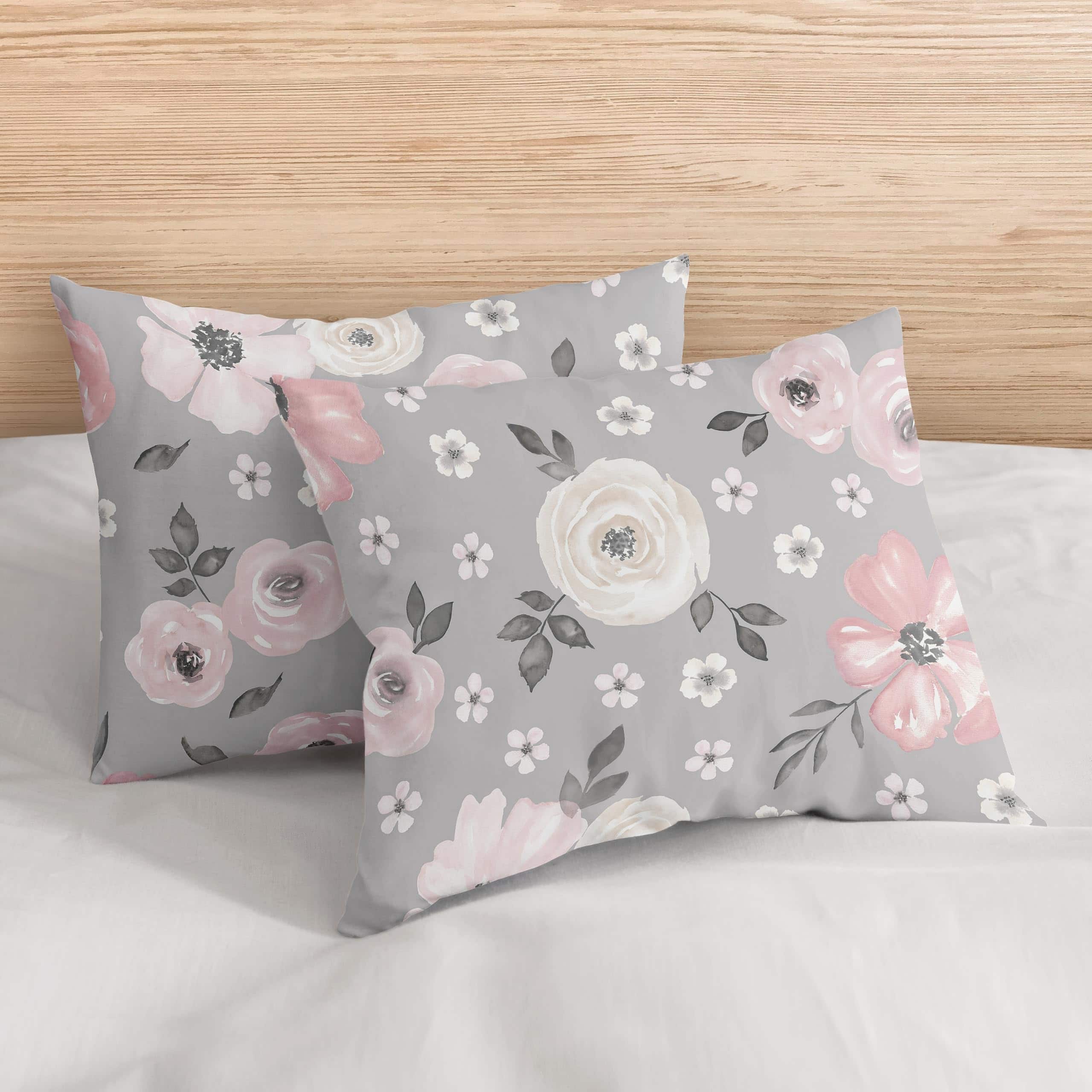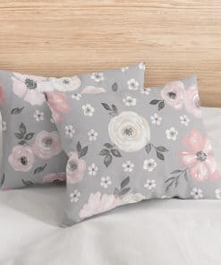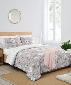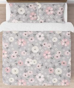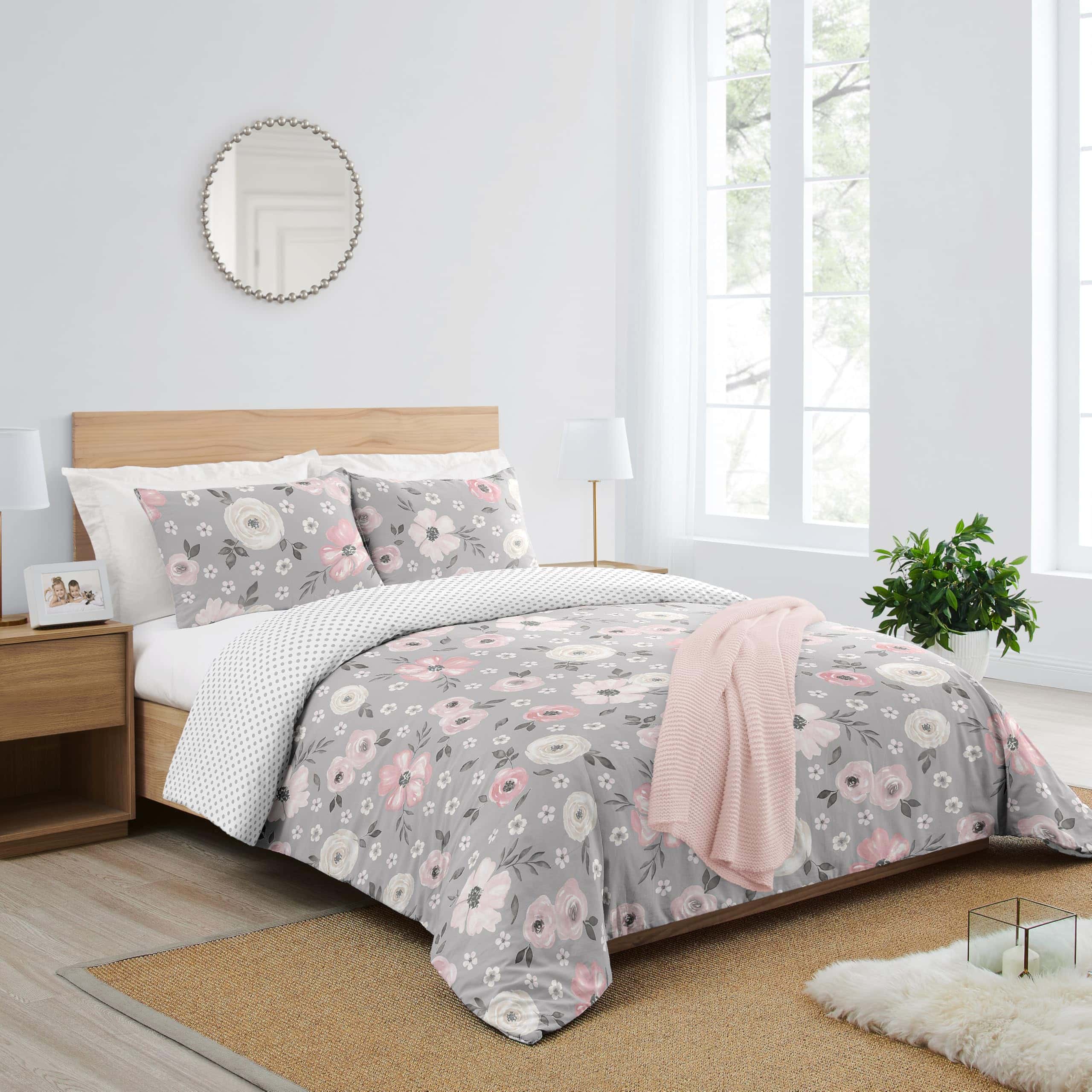 Este juego de edredón incluye un diseño exclusivo de flores de rosa pintadas a mano y mini lunares grises. Está fabricado con tejido de microfibra cepillada y es lavable a máquina. Secar en secadora a baja temperatura. Este diseño tiene accesorios a juego como tratamientos para ventanas, cestos, cortinas de baño y cojines.