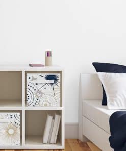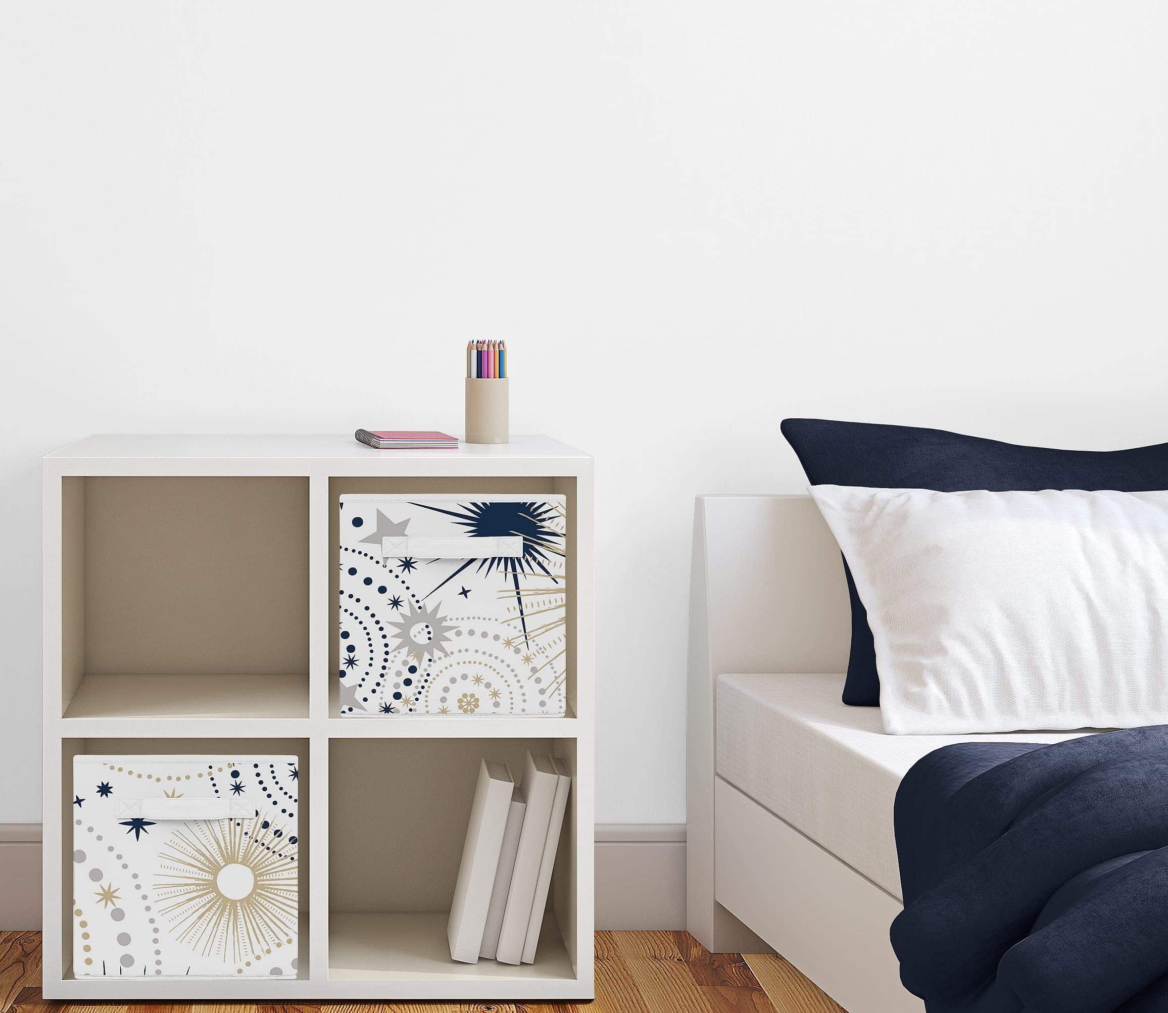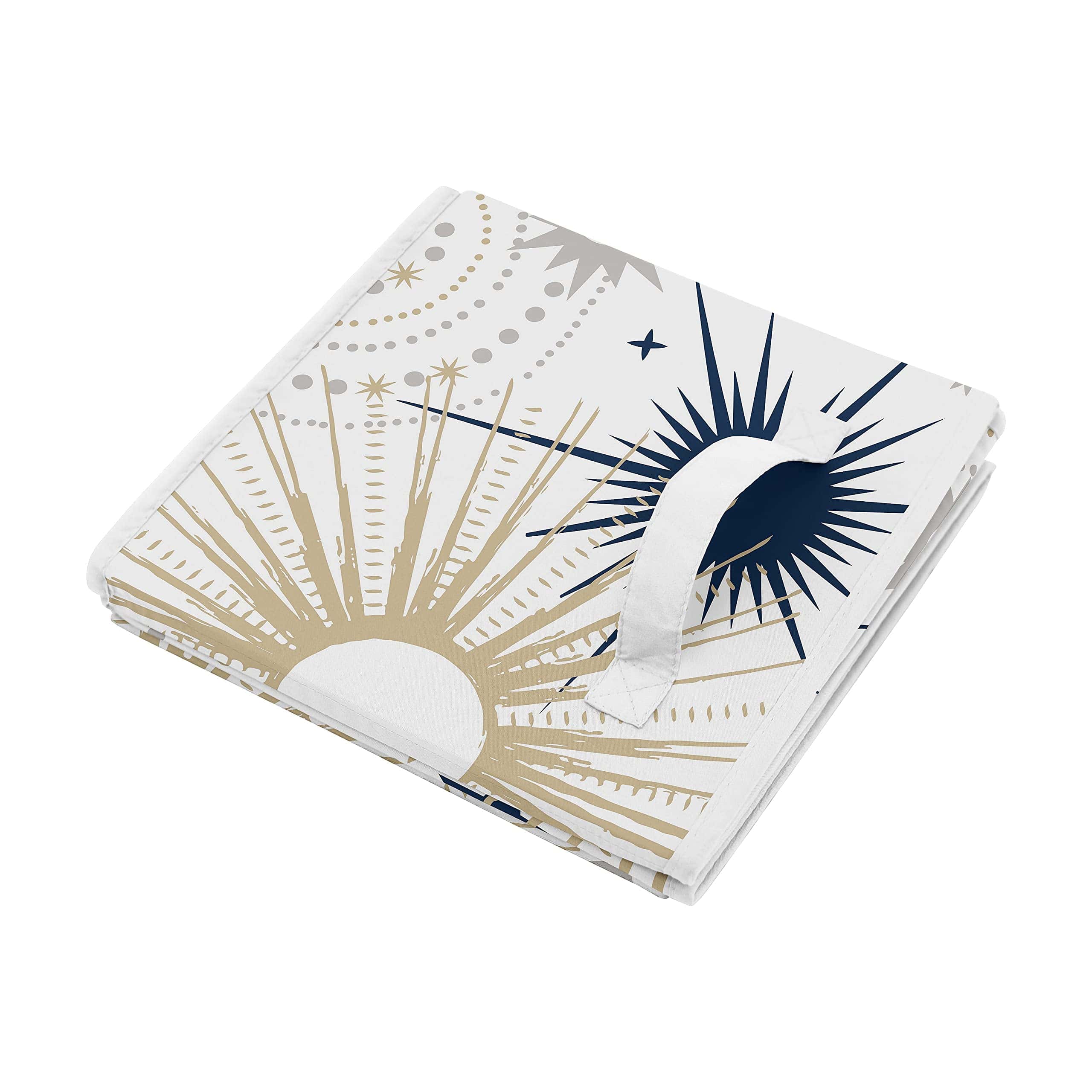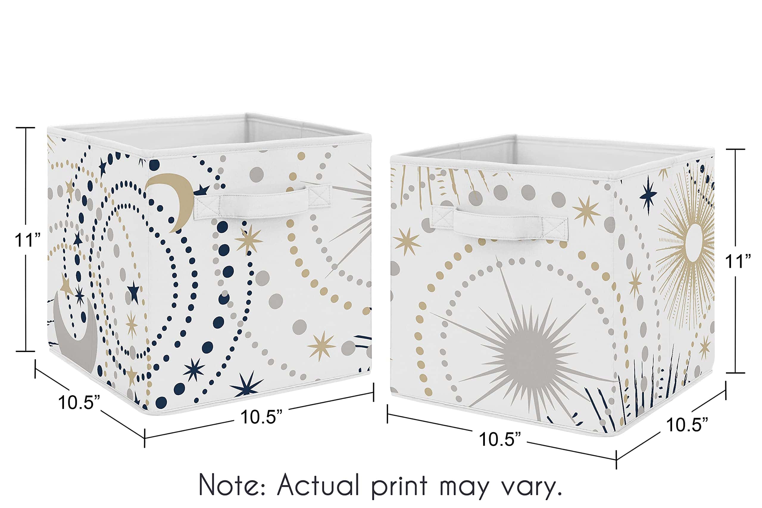 Set de 2 cubos de almacenamiento de tela plegables de Sweet Jojo Designs, perfectos para organizar juguetes, ropa o cualquier otro objeto en la habitación de los niños. Cada uno mide 11 pulgadas de ancho, 10.5 pulgadas de profundidad y 10.5 pulgadas de altura. Presenta un hermoso estampado celestial de estrellas y lunas en tonos azul marino, oro y gris, ideal para un ambiente neutro y unisex. Los mangos de tela reforzados permiten un movimiento suave de los cubos en estantes de cubos estándar. Limpieza fácil con un paño húmedo. Combina estos cubos de almacenamiento con otros productos de Sweet Jojo Designs en el mismo tema para completar la decoración de la habitación.